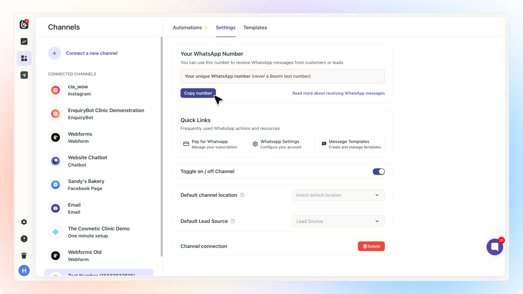 Within the Settings section in your WhatsApp Channel, users can manage: