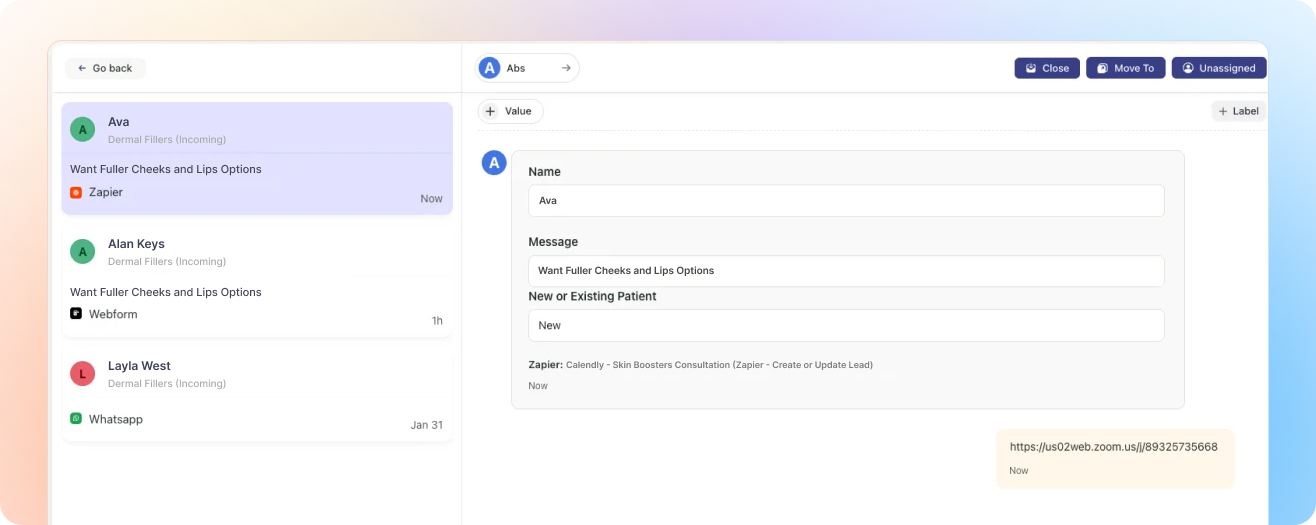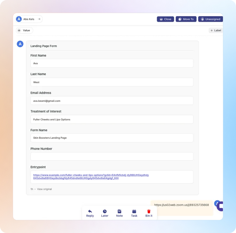 Optionally, the lead is moved to a new stage (e.g. “Consultation Booked”)