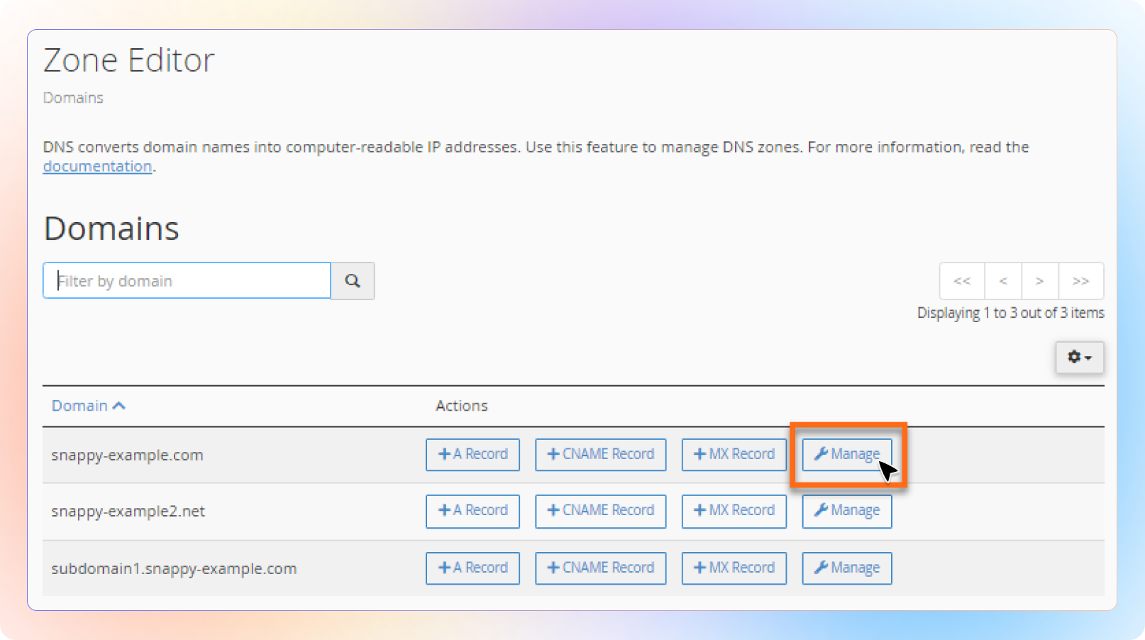 In your selected domain, click its “Manage” button.