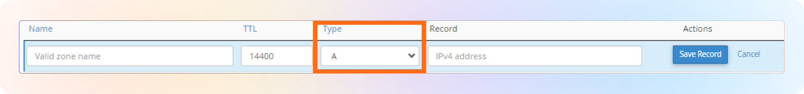 Select the DNS from the Type dropdown, then enter the values (from Beami) to complete both records.