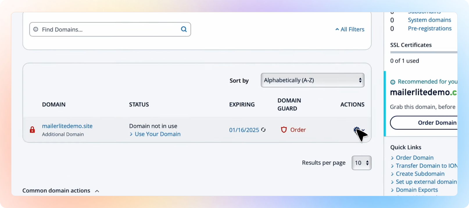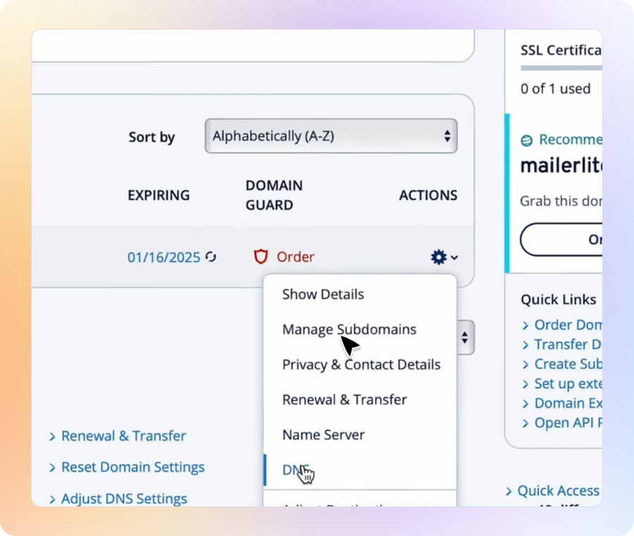 Find the domain you want to verify and click on the gear symbol under Actions and select DNS.