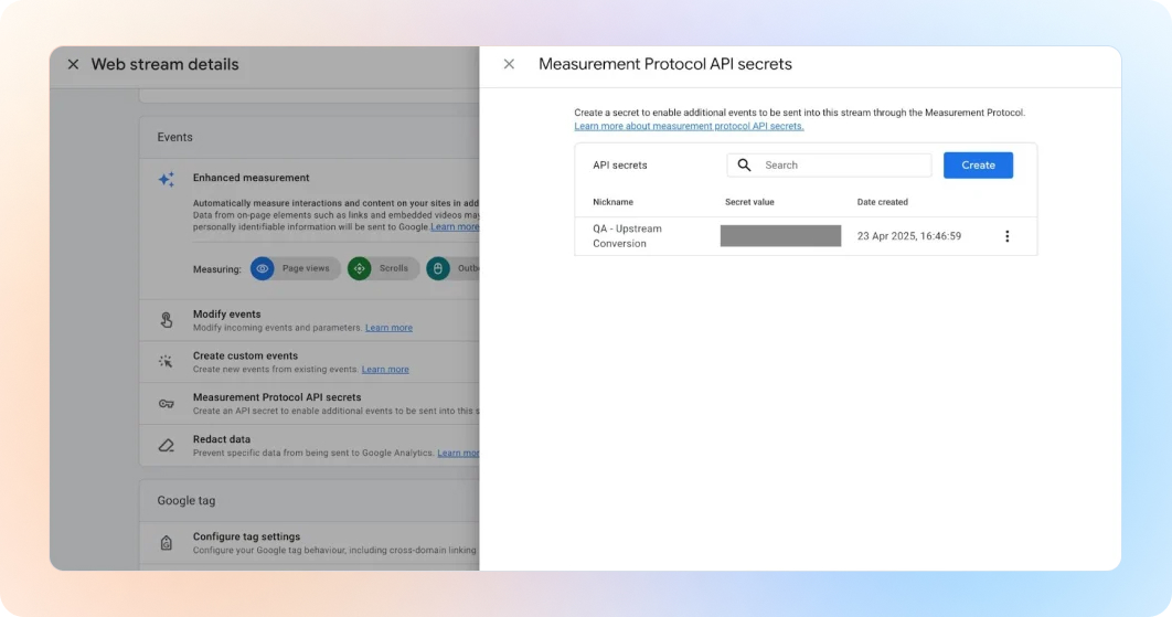 In the same stream screen, scroll down to Measurement Protocol API secrets.