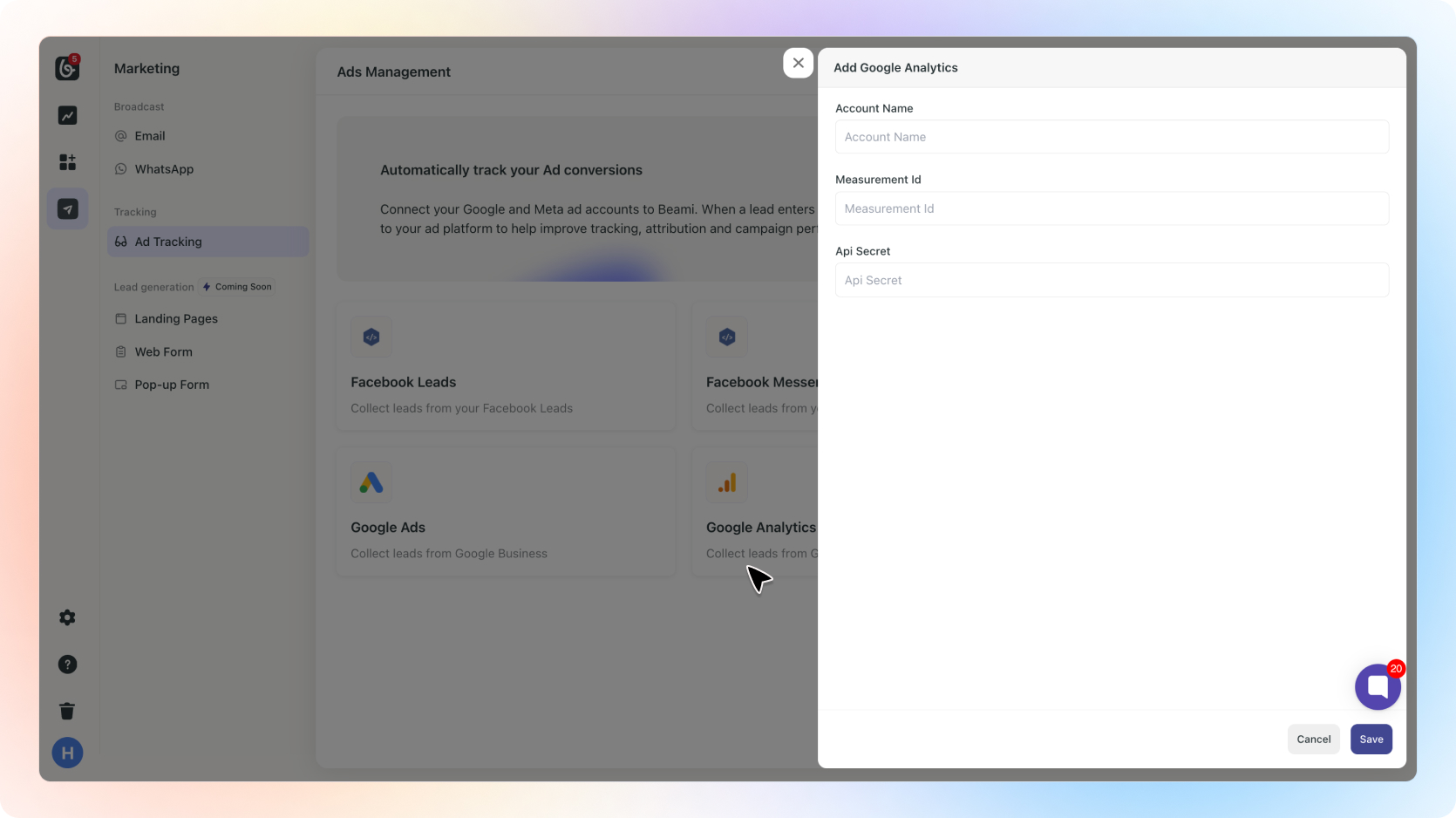 Done! Beami can now send updates to your Analytics account when leads come in or progress through your stages.