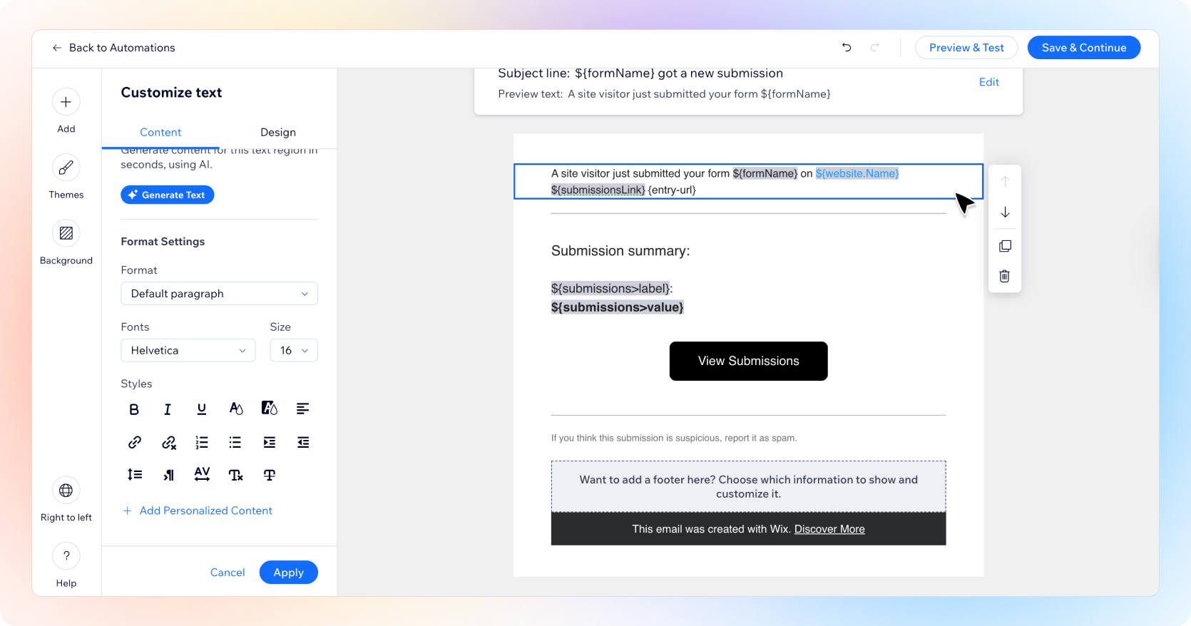 Click the + Add Personalised Content button/link → add {submissionsLink}