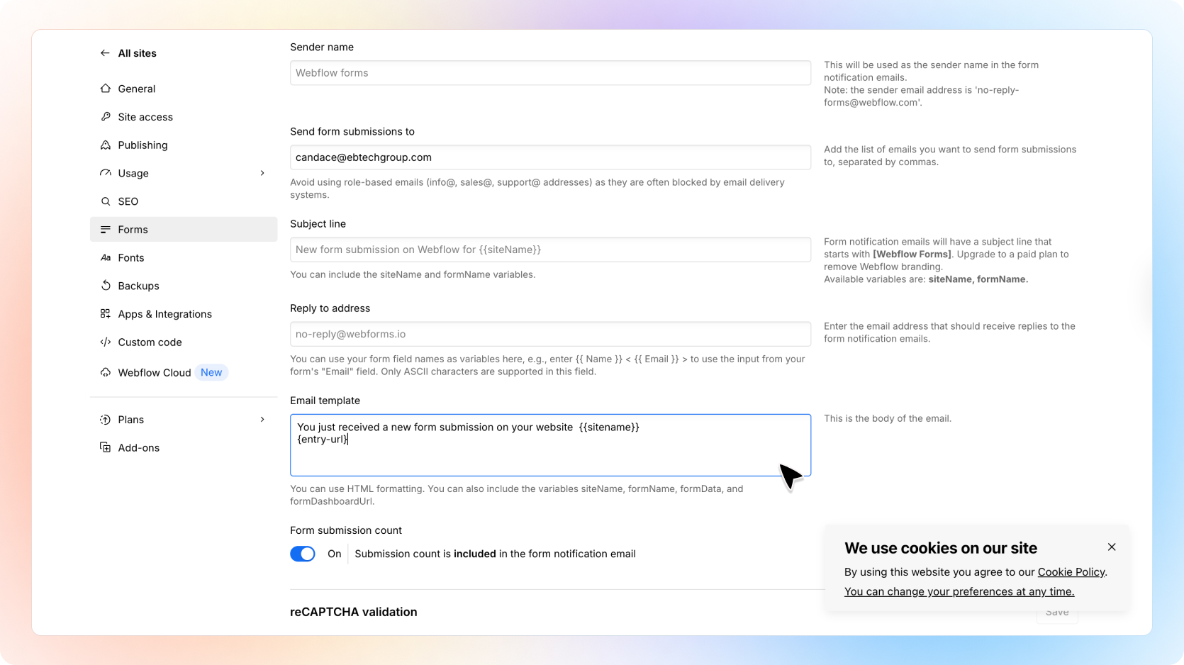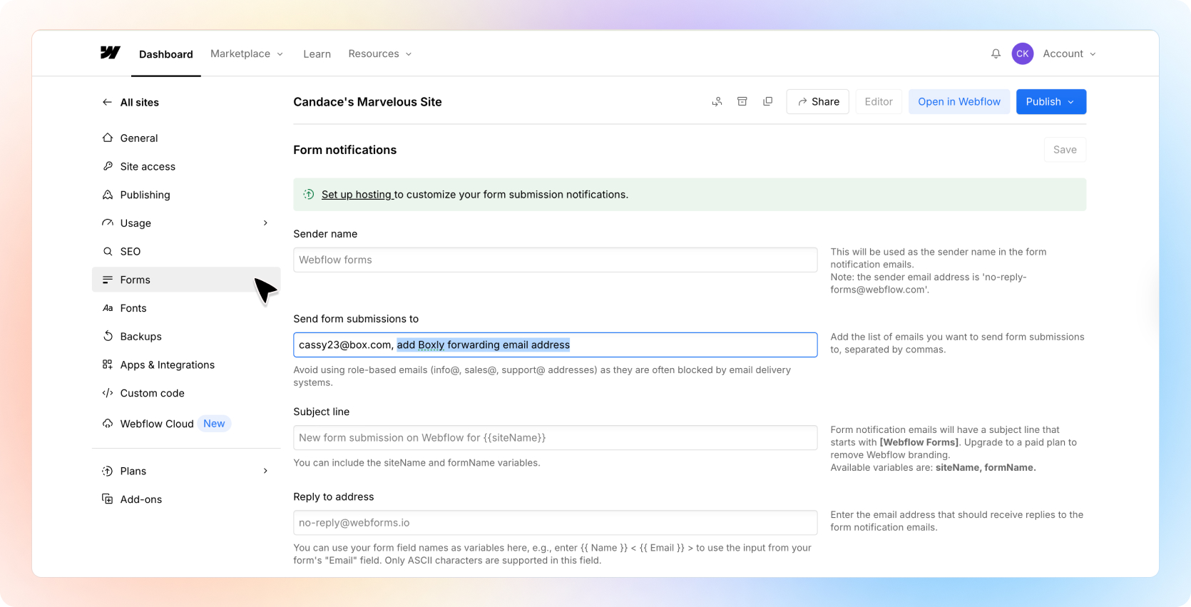 This email forwarding address is how Webflow forms knows where to send form submissions to.