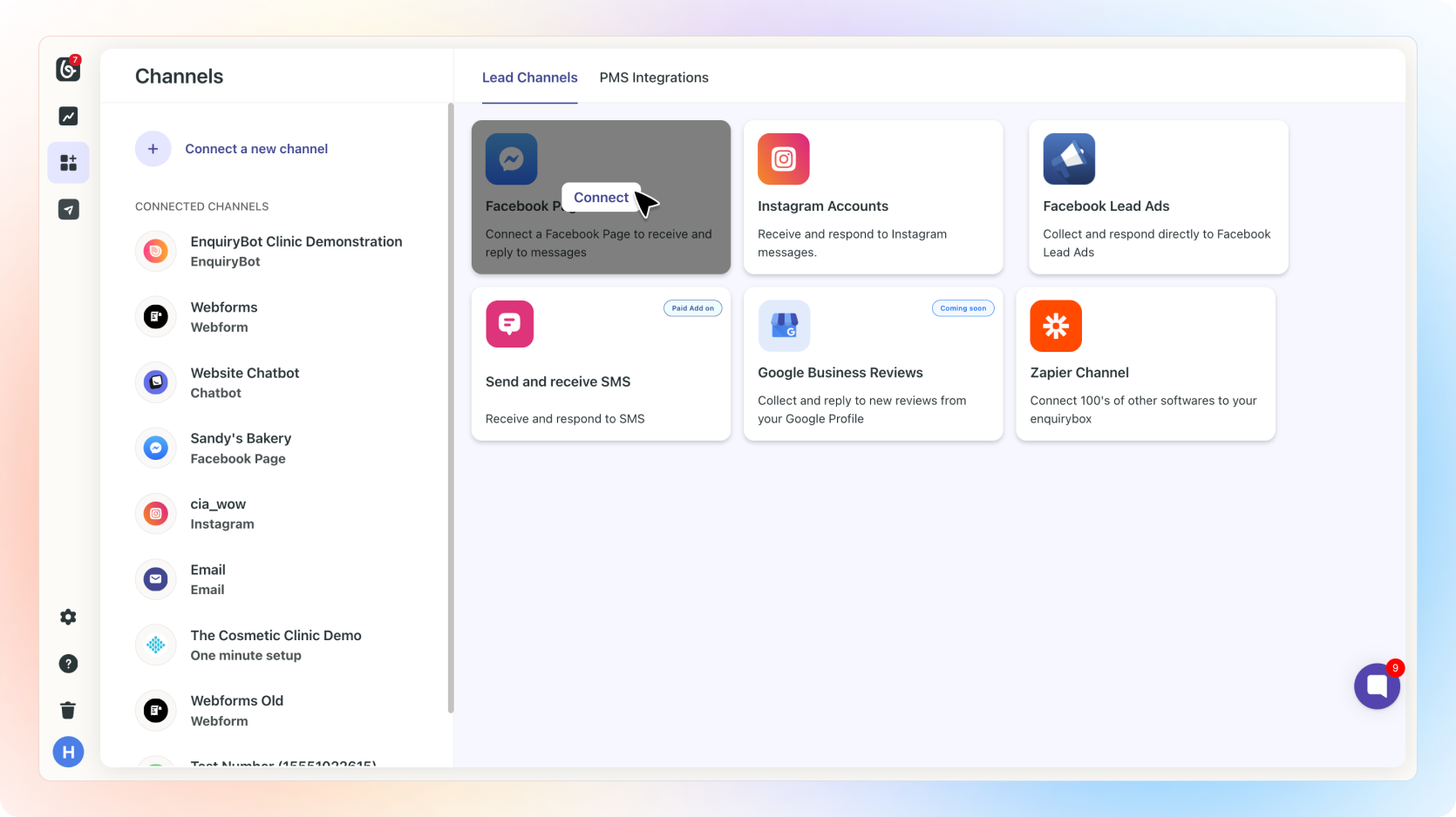 Click the channels icon on the left-hand menu and then click “Connect” on the Facebook Pages channel.