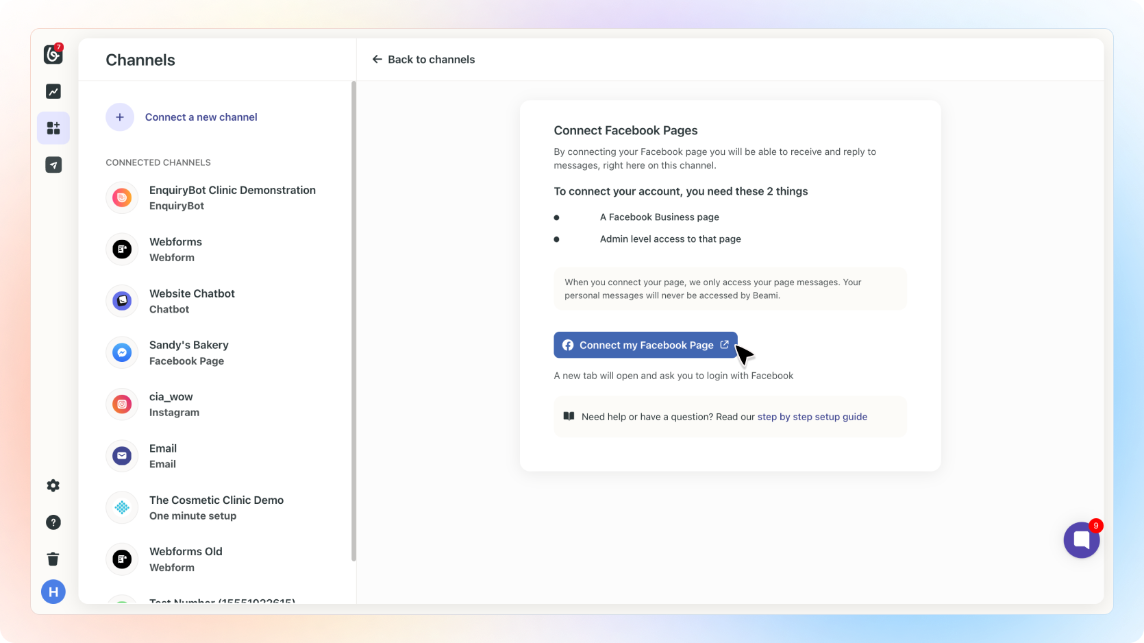 When you connect your account, we only access your Facebook Page/s Messages. Your personal messages will never be accessed by Beami.