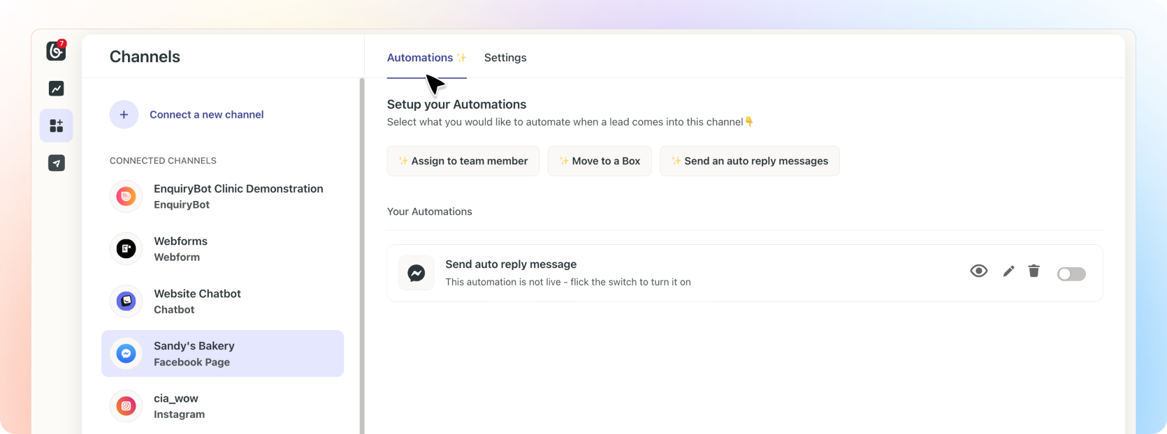 To setup your automations, click on the relevant Facebook Account in your connected channels.