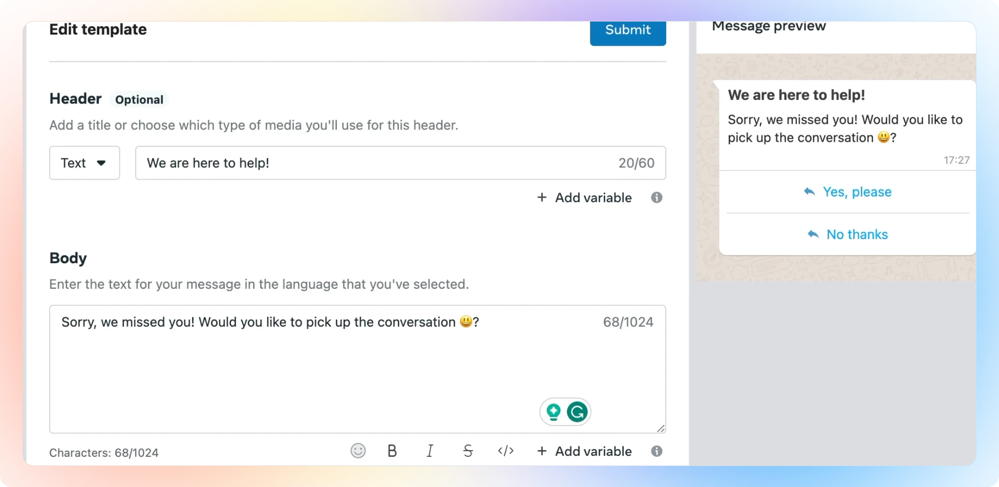 (If you haven't yet connected your WhatsApp channel go to this article for the step-by-step guide - Connect WhatsApp Business)