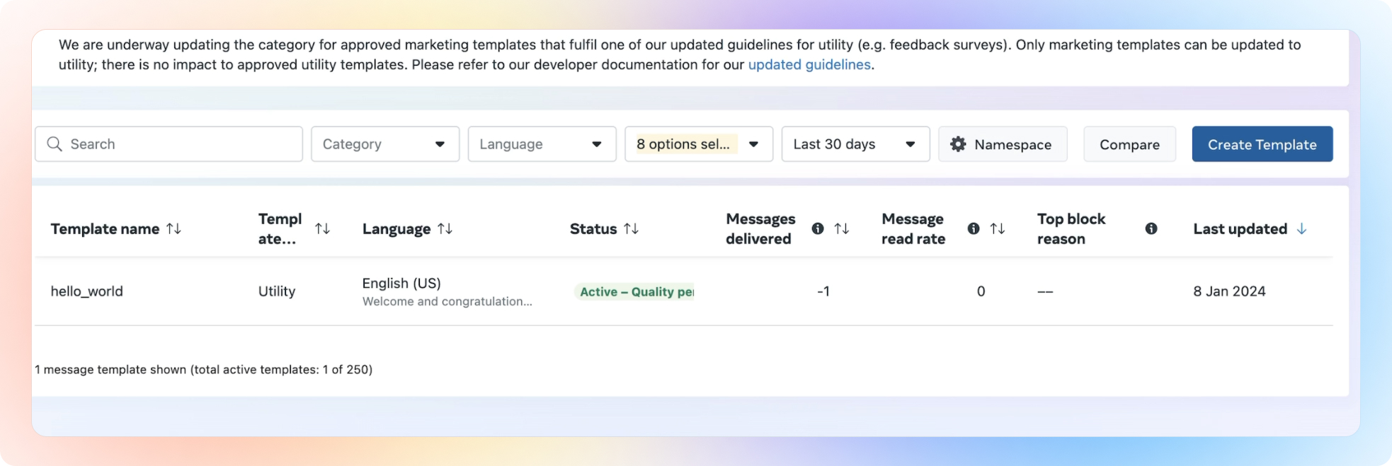 The templates will be listed and their status will be shown in the Status column, you will be able to see whether or not Meta has approved the templates here.