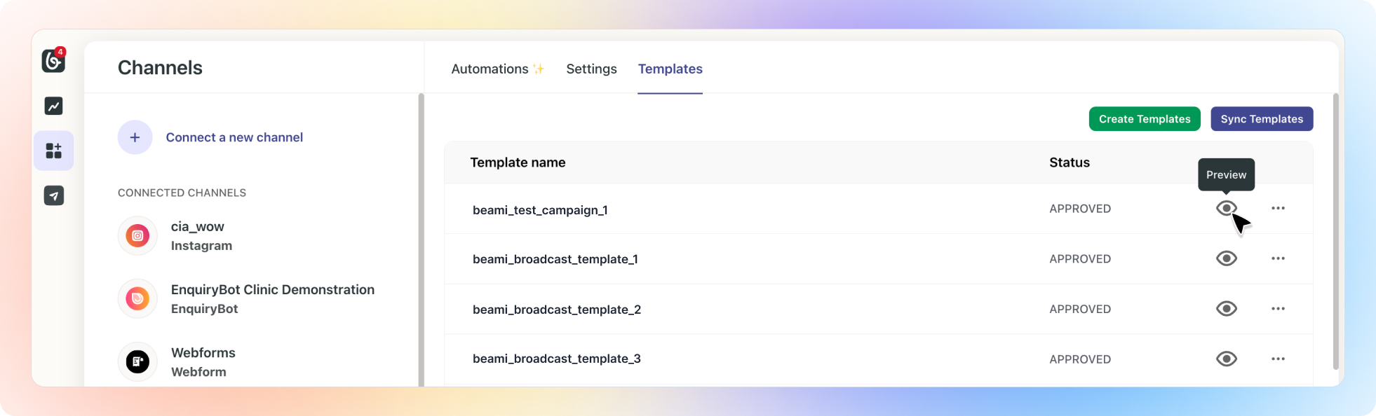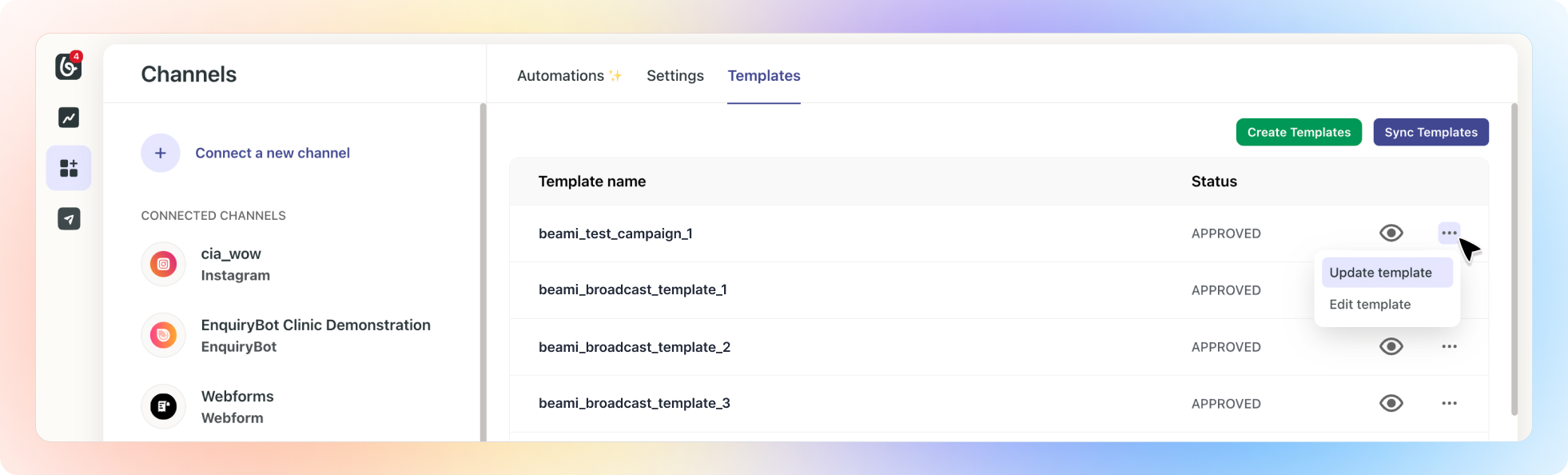 Click the "Sync Templates" button in the top right to bring all your created templates in Meta into Beami.