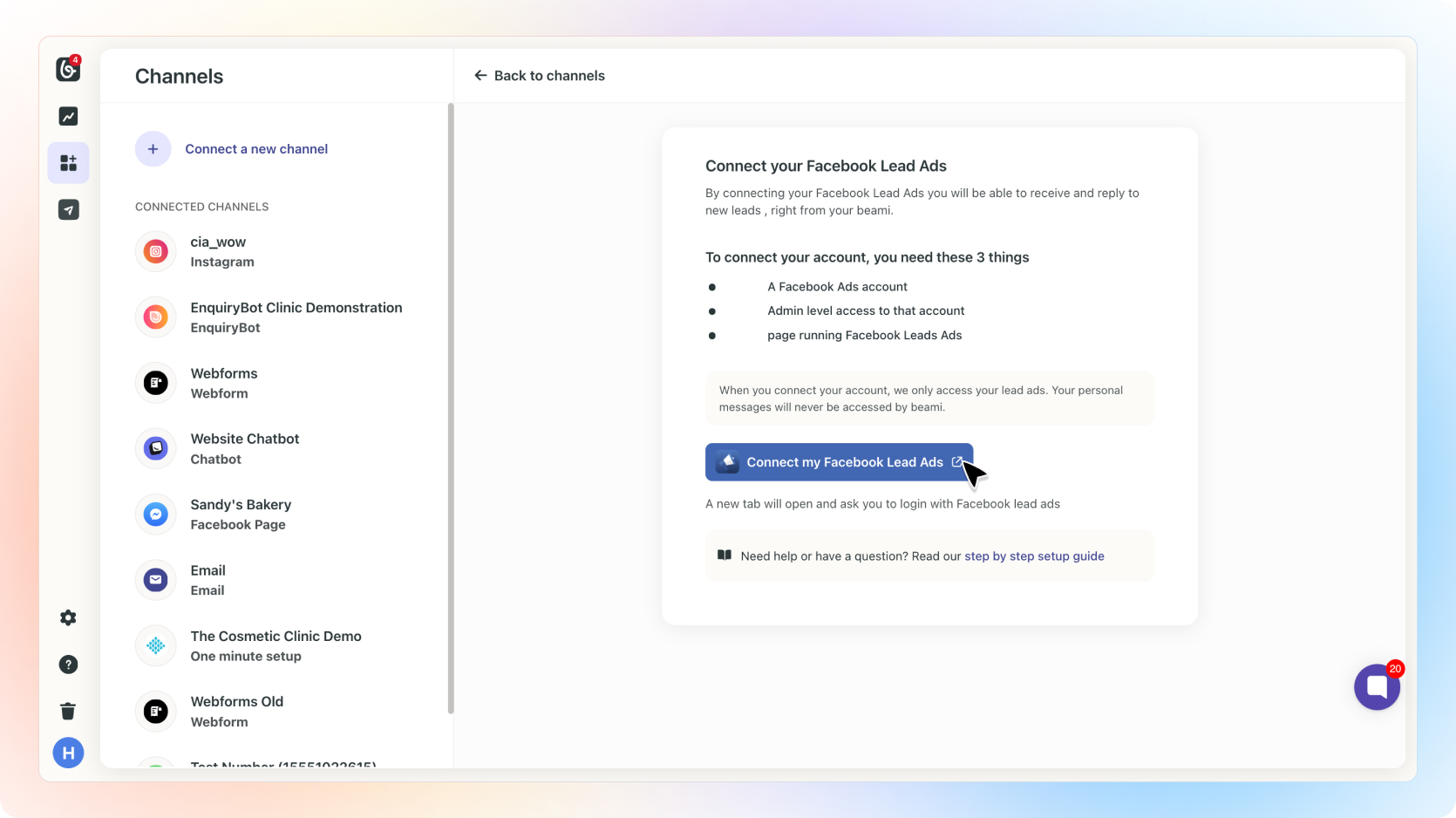 Head over to the Connect Facebook Lead Ads article for the full run down as to how to connect your channel and bring Facebook Lead Ads into Beami.