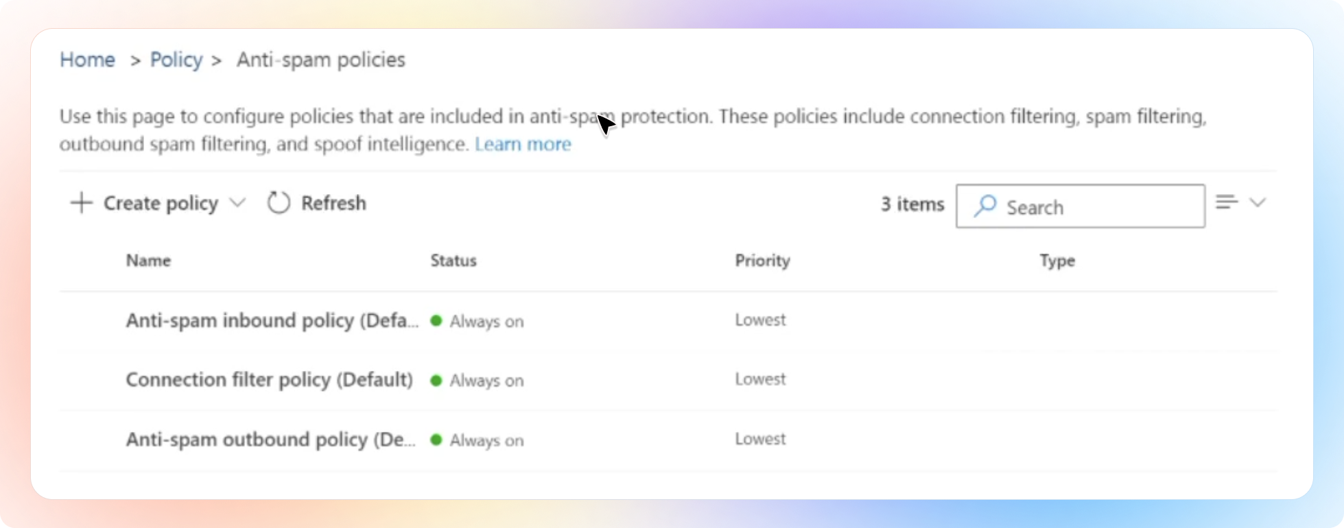 Navigate to Email & collaboration > Policies & rules > Threat policies > Anti-spam policies.