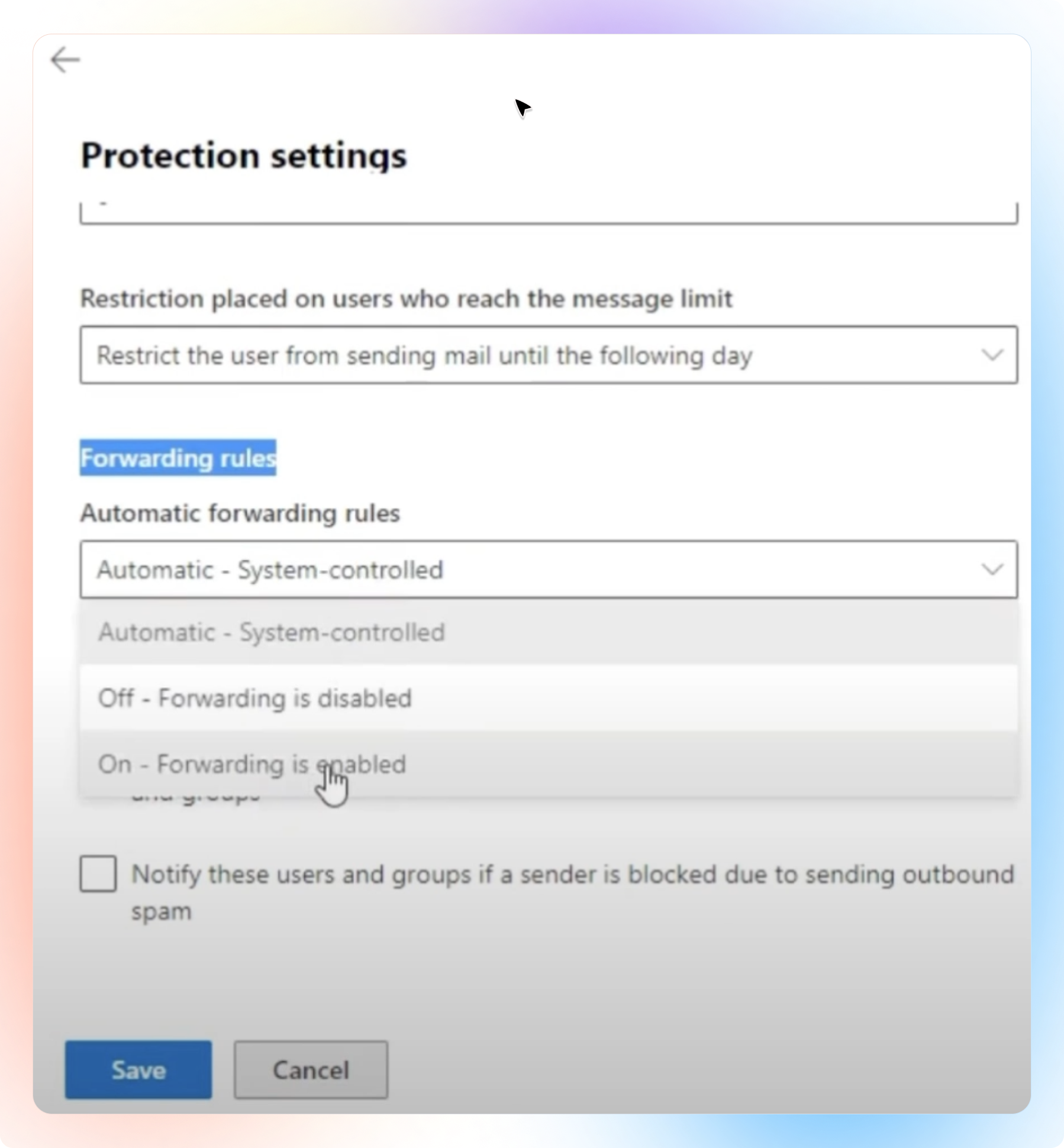 External forwarding for Outlook 365 is now enabled, and you can set up the forwarding as needed.