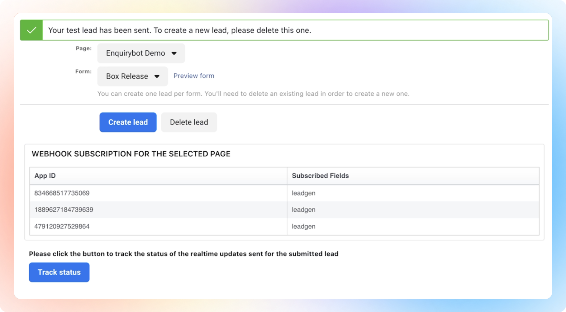 At the bottom left, click "Track Status." This shows the connection results for your lead ad configuration.