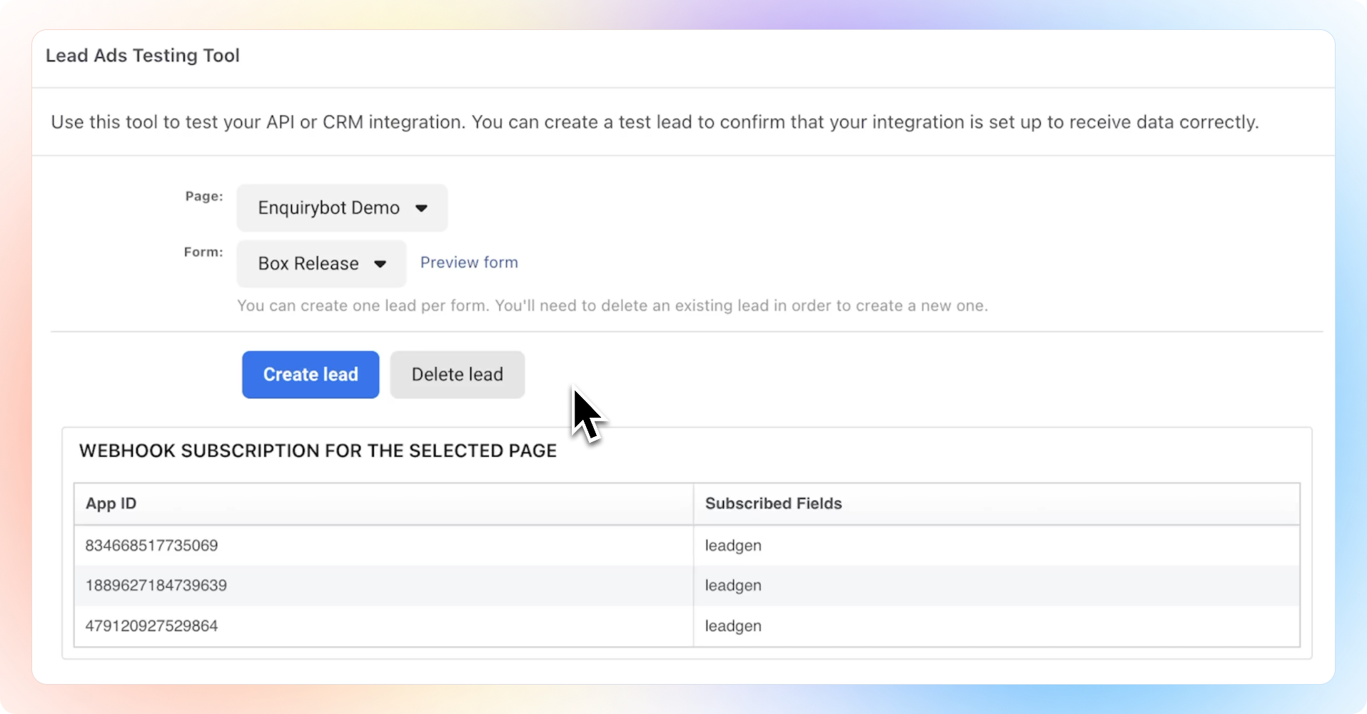 Head to the Lead Ads Debugger at https://developers.facebook.com/tools/lead-ads-testing. Click "Create Lead" to send a sample lead.