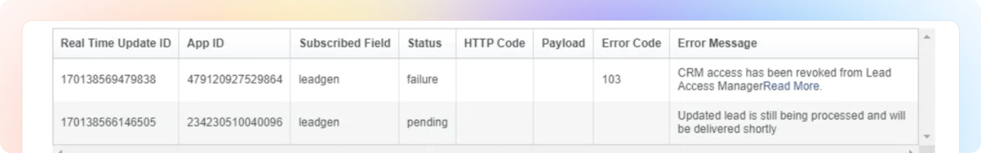 If status is "Failure," check the error message for clues like "CRM access revoked."