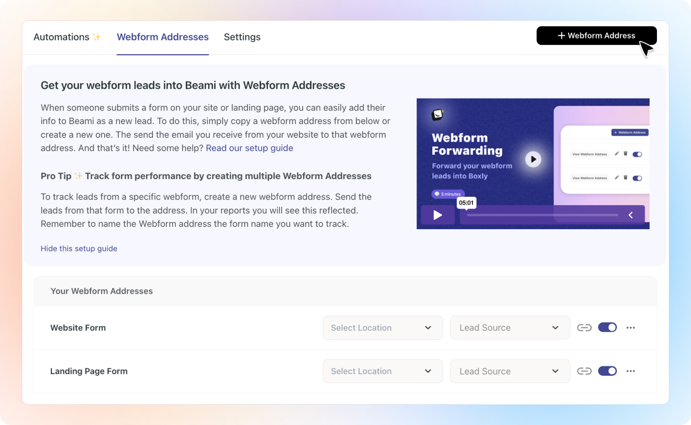 Webform Forwarding: When someone fills out a form on your website or landing page, you can send the lead directly to Beami. You can either forward these webforms straight from your website to Beami, or create a Beami webform address to automatically filter and send these emails into Beami.