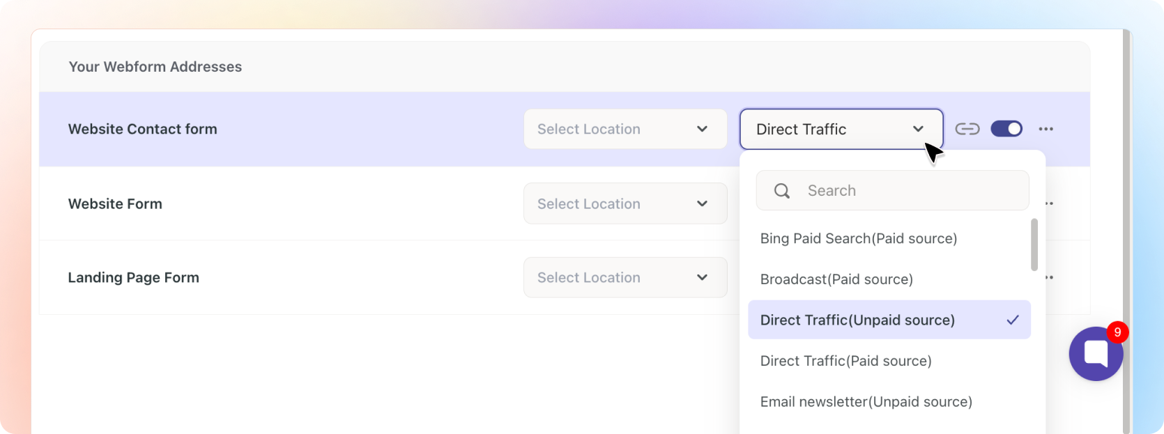 Select a default Lead Source in the dropdown menu for your forms/channels for clear insights.