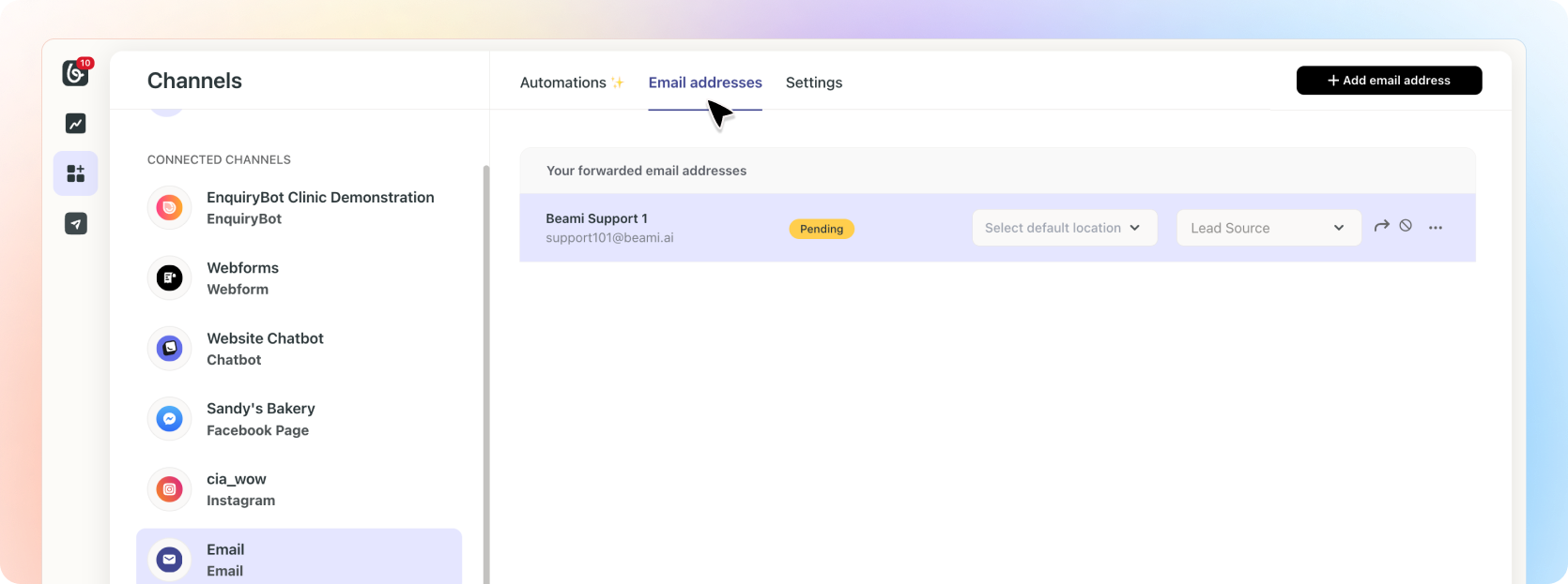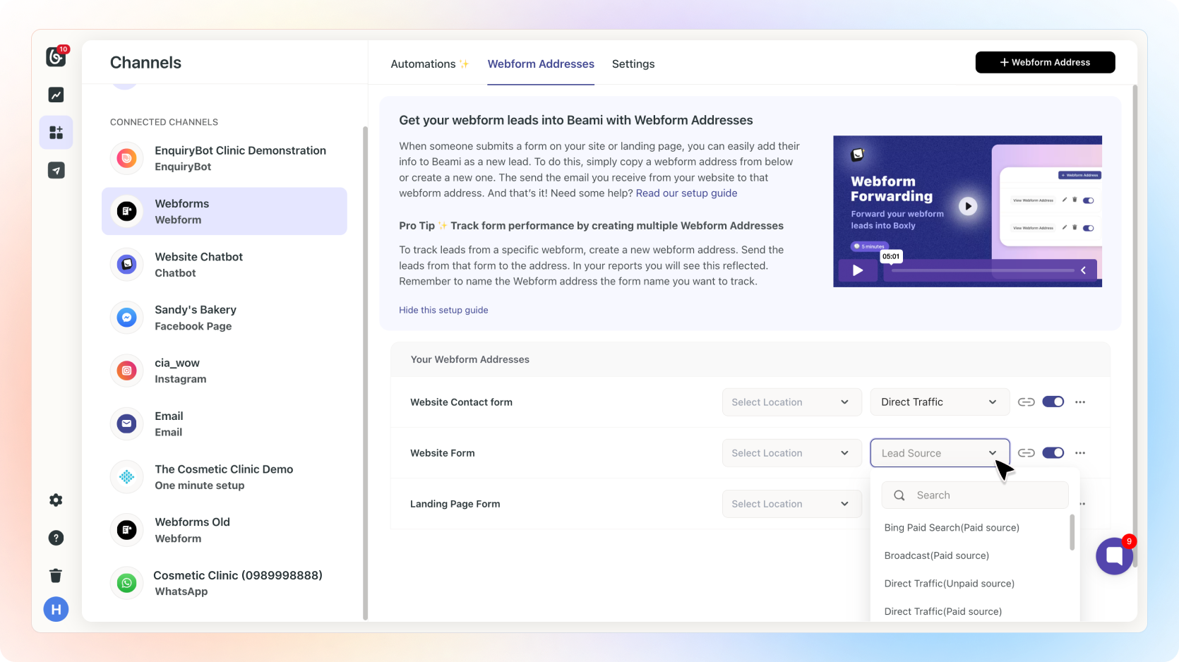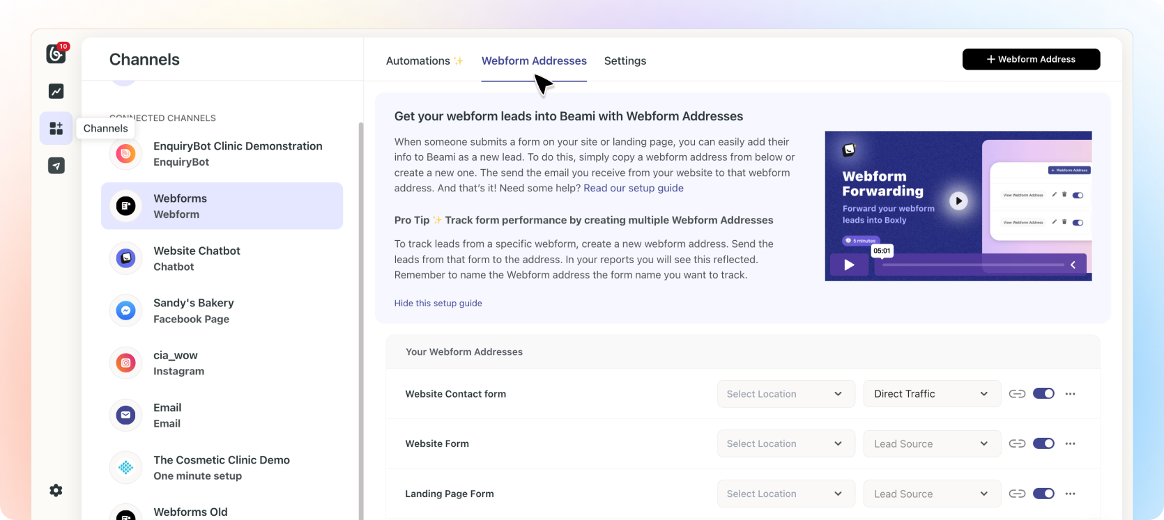 As shown in the image above, the Webform Addresses section within Channels lets you see exactly which forms are generating leads and you can assign a default lead source to a form/address. Whether it’s website forms, landing pages, email addresses, or SMS, Beami helps you organise and track every lead.
