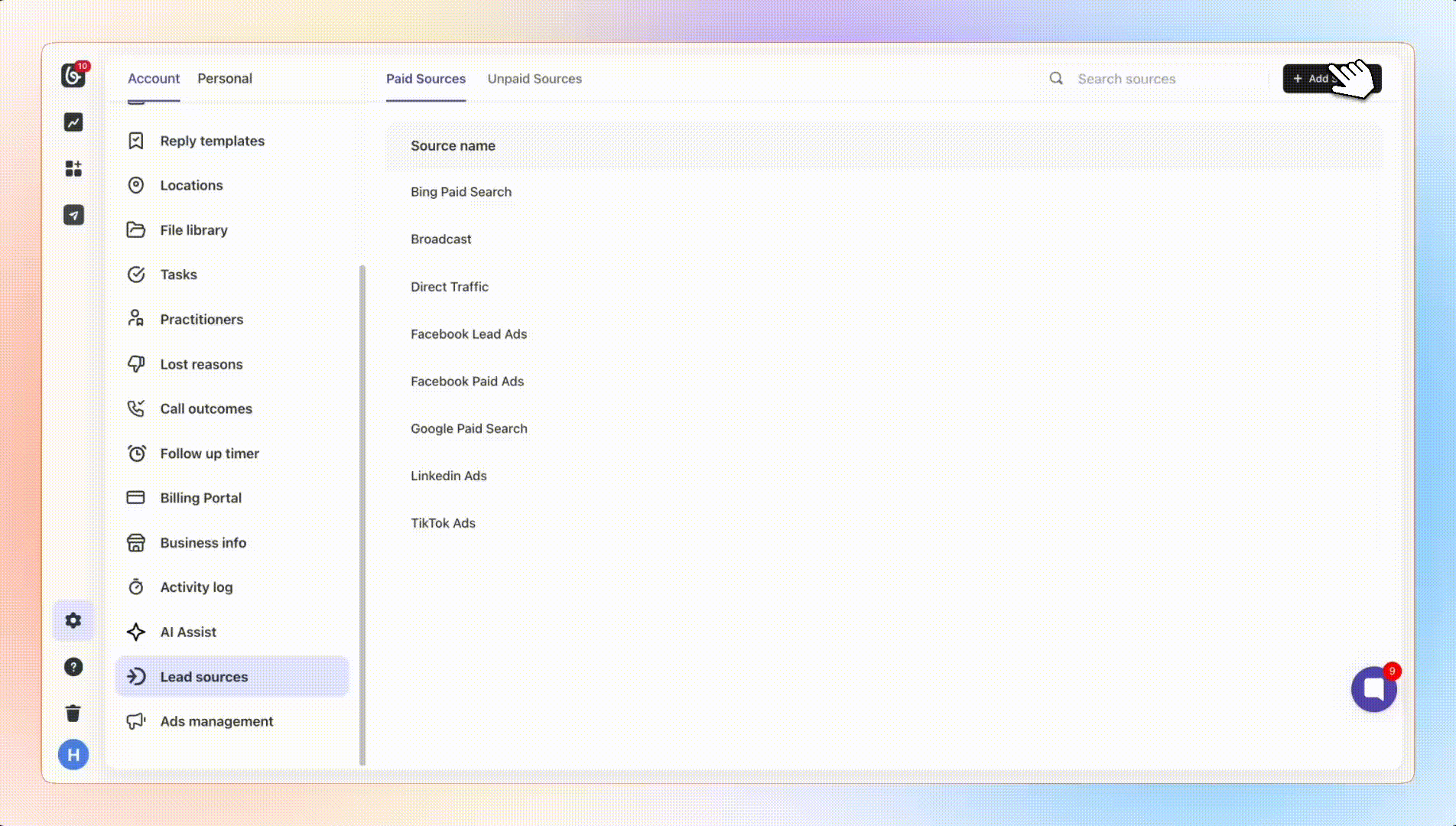 Go to "Lead Source" and in the dropdown menu manually select the appropriate lead source—you have both Paid and Unpaid options. Whichever lead sources you added in settings will appear here.