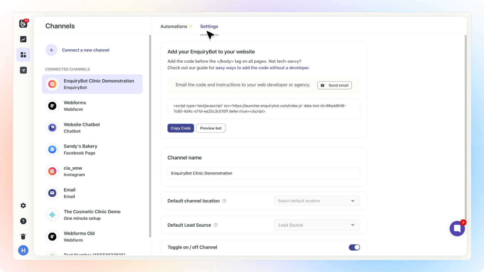 On the Connection Screen, you'll find the EnquiryBot script that you can easily share with your developer. Simply click the "Send Email" button, and add the email of your Web developer, making it convenient for your developer to integrate the bot into your systems.