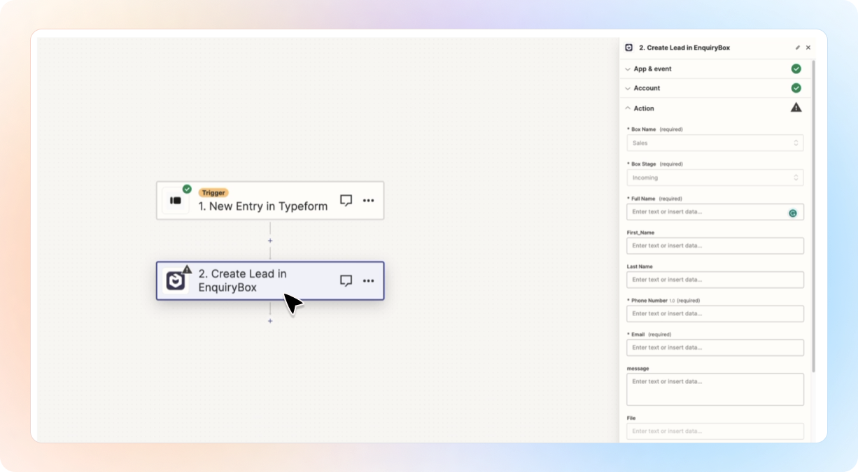 Now on the right hand side, select the box and stage you want the Typeform entry to go into and map the Typeform form fields to the Beami fields.