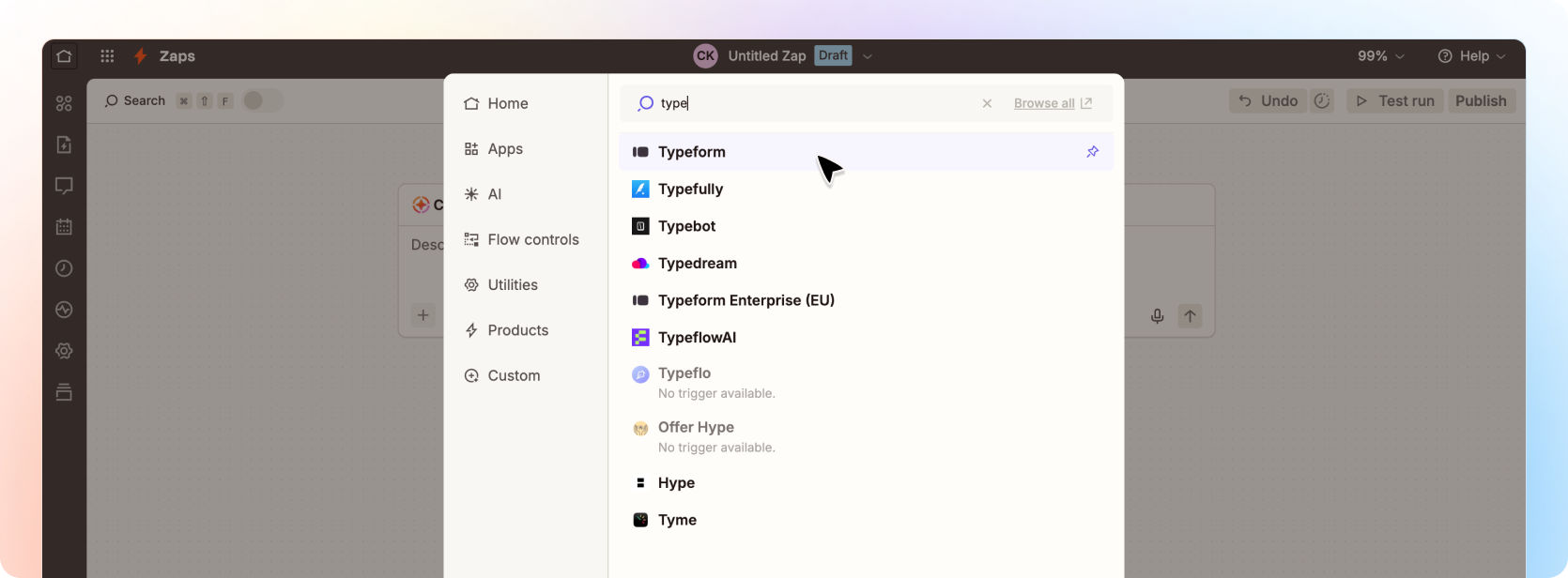 The trigger is software that starts the zap. In our example, we will search for Typeform as we want the trigger to be when a new form is submitted in typeform to send the enquiry to Beami.