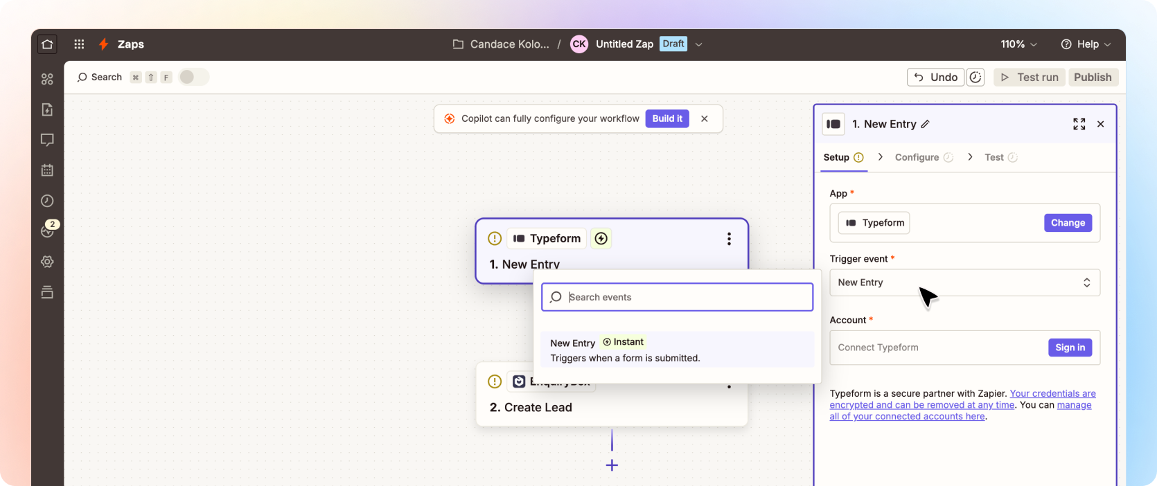 In this example, on the right hand select the trigger event. In this case it's a "New Entry" to a Typeform.