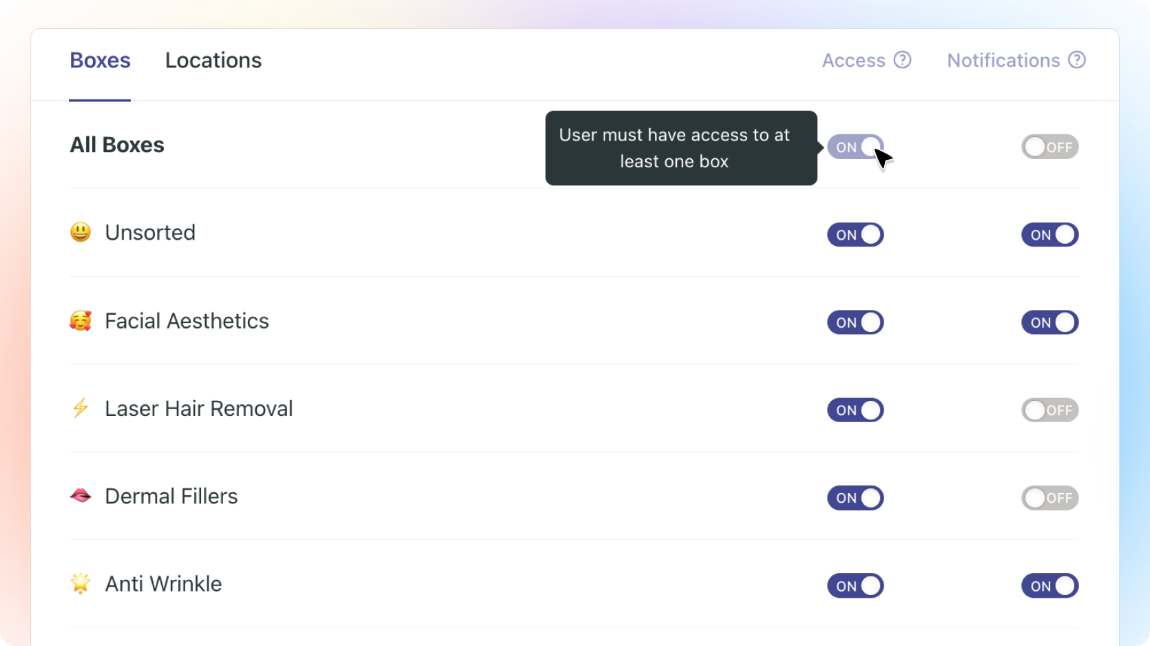 Toggle all access to Boxes ON, to activate them all. You can’t toggle access OFF for every box as you always need at least one active Box (otherwise that team member wouldn’t be able to view anything).