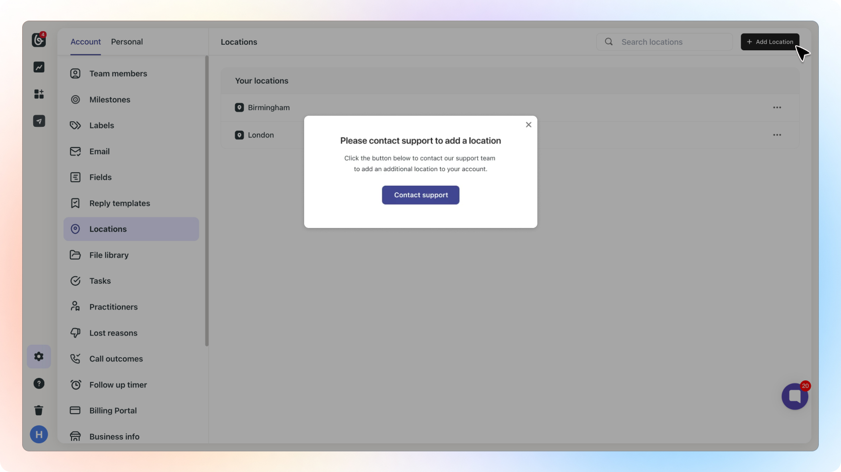When you sign up for the location plan, you will no longer have the ability to add or delete locations yourself. Instead, you’ll need to contact the Beami sales team to manage your locations, in location account settings click “Contact Support" to delete a location.