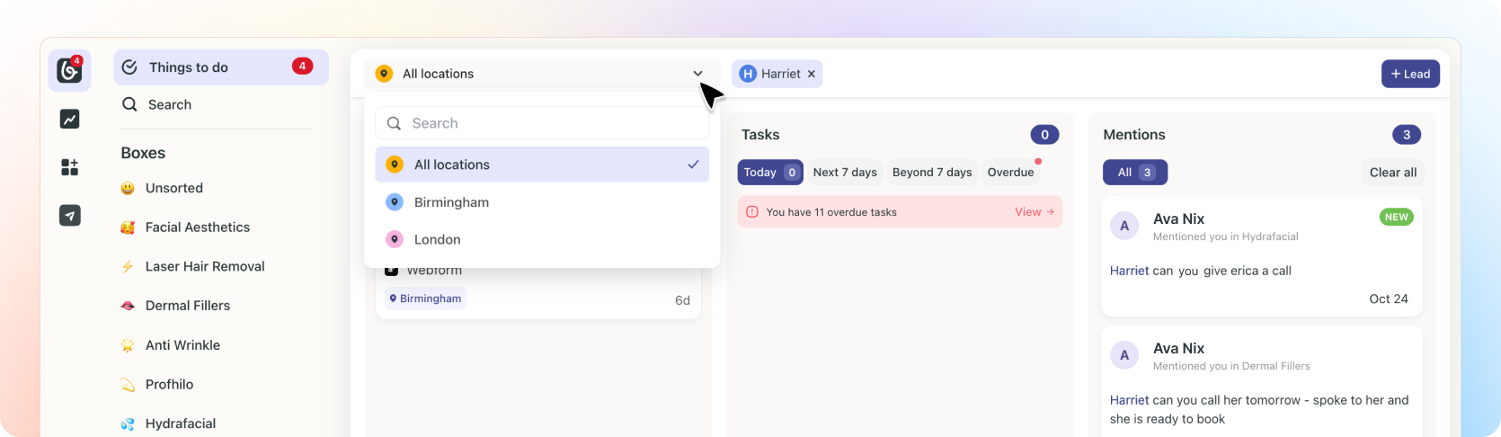 Additionally, Athena Cosmetics Clinic can customise their lead management. For example, they can choose to have their central team handle most leads while allowing individual practices to manage less critical or lower-value leads. The multi-location plan provides flexibility for this kind of tailored approach.