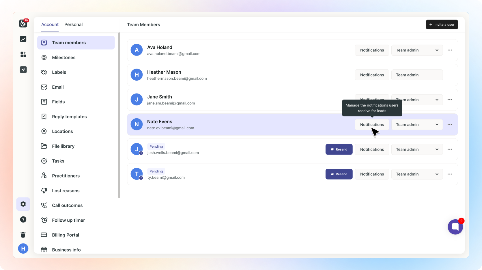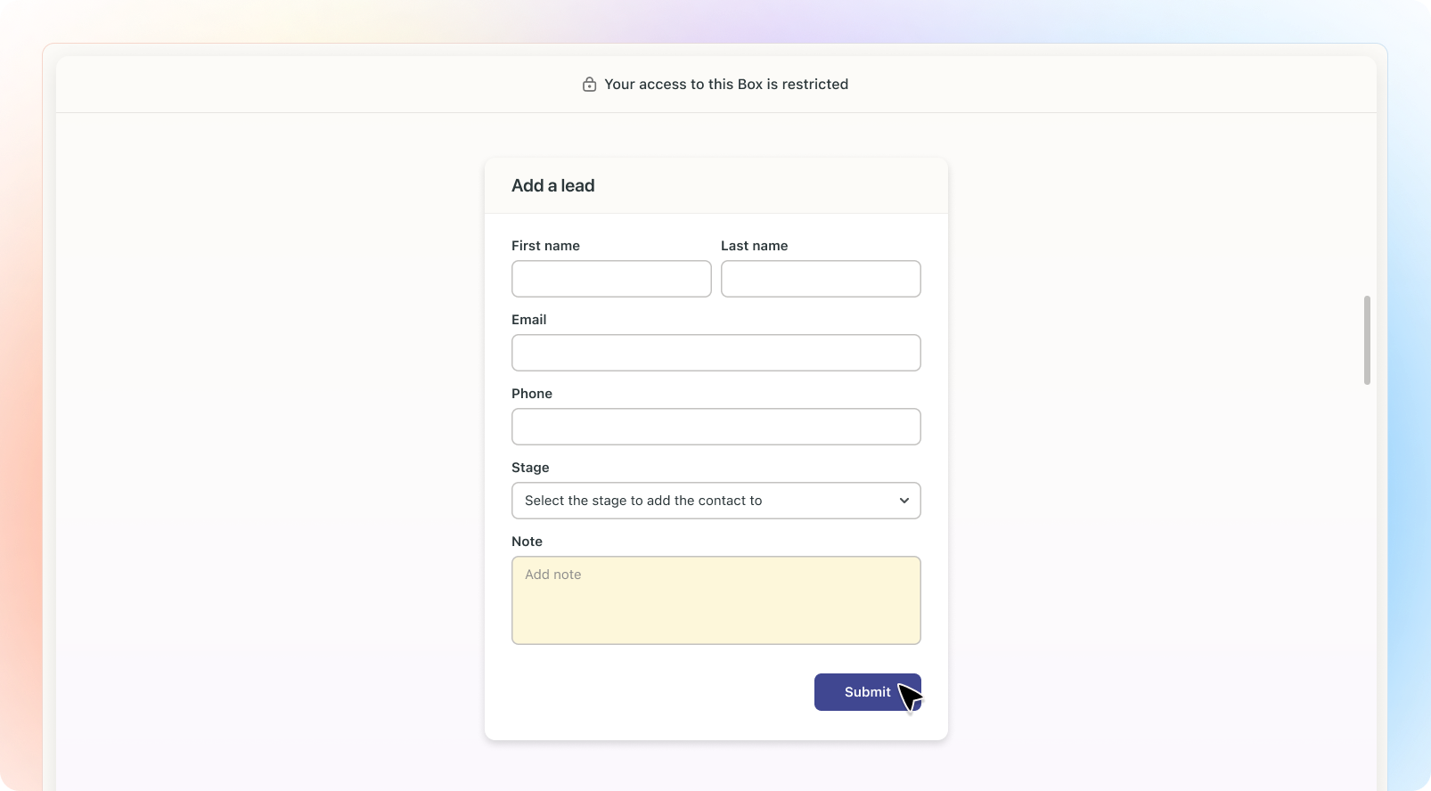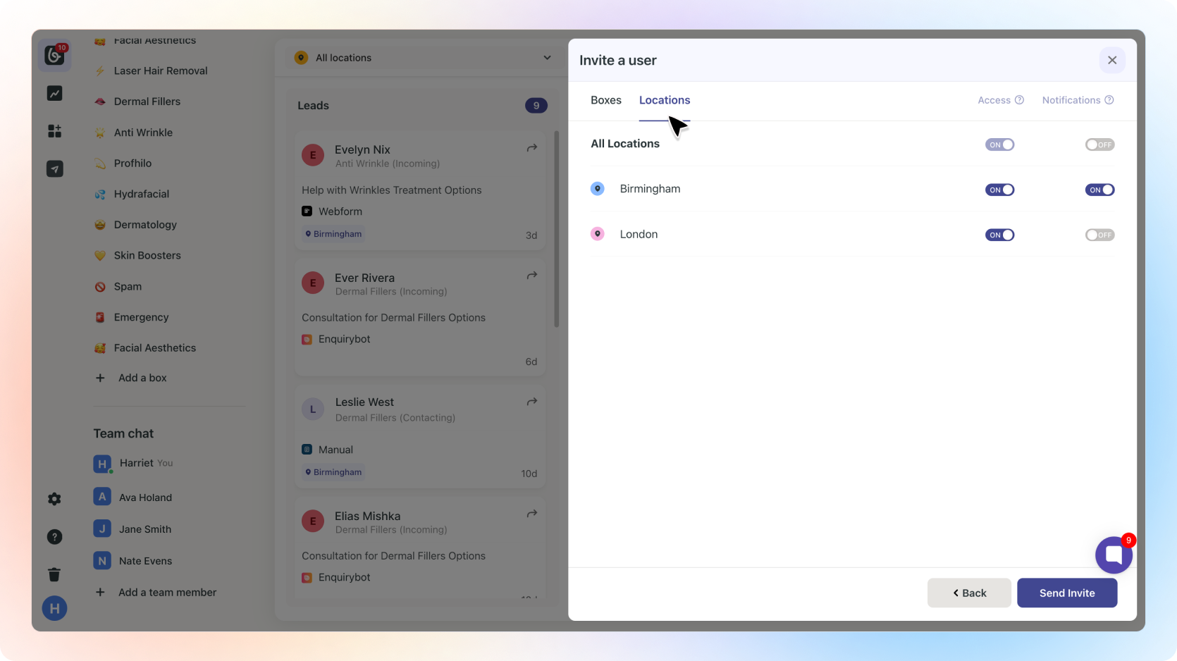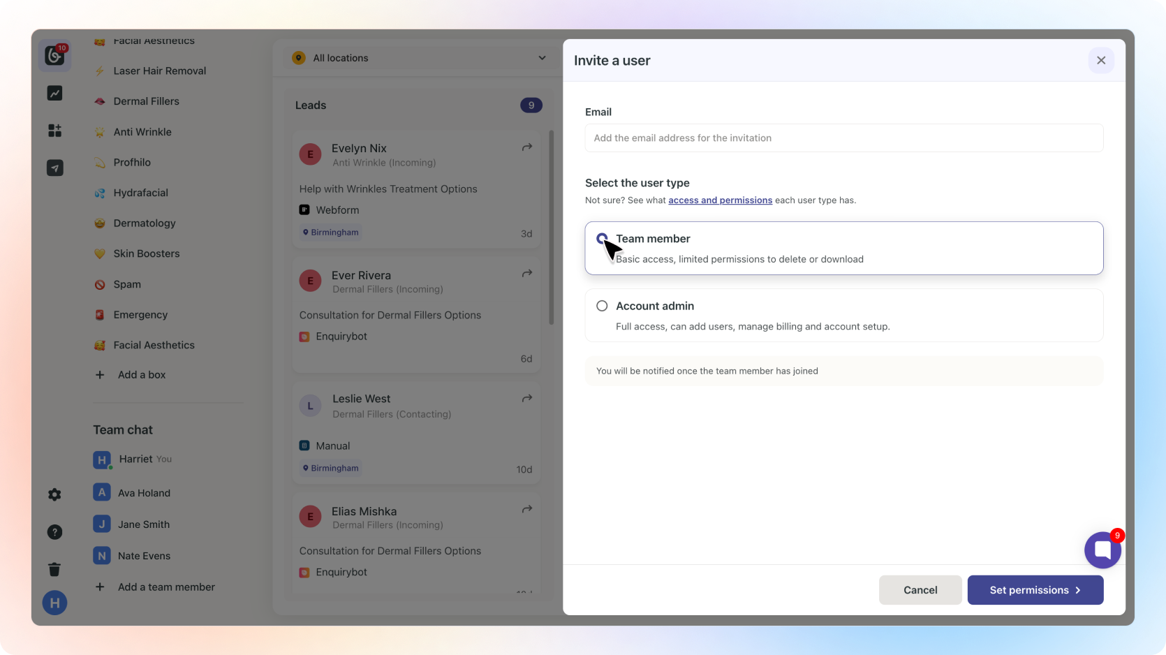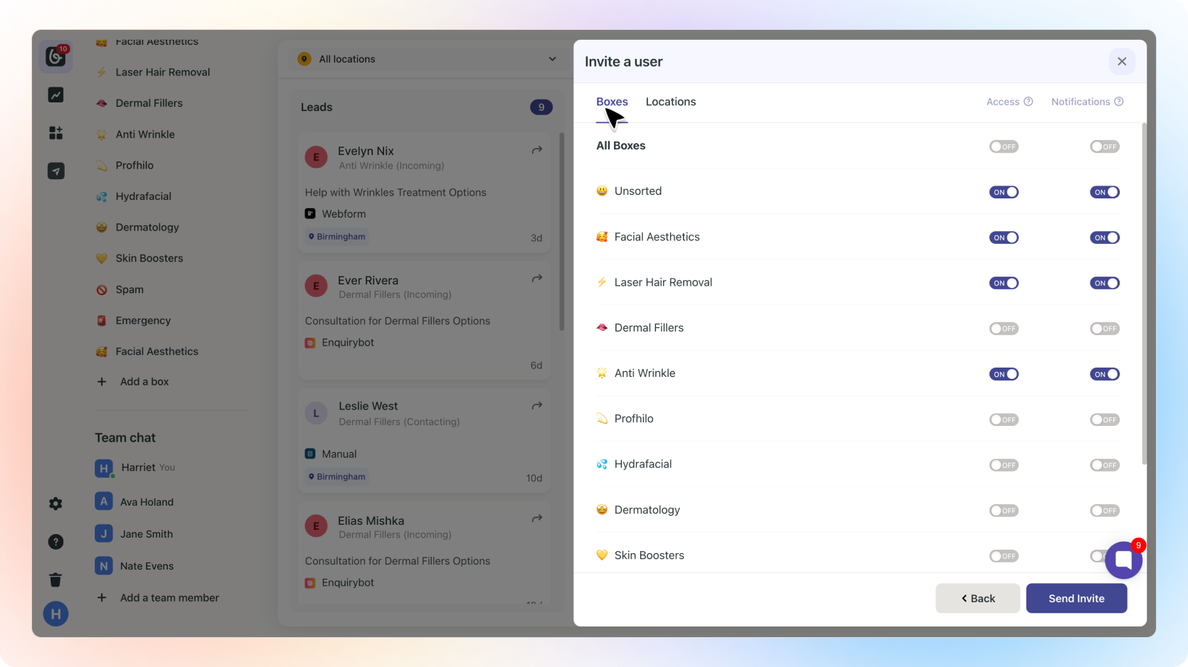 In permissions select which Boxes your new user/team member has access to and if they receive lead notifications for the Boxes.