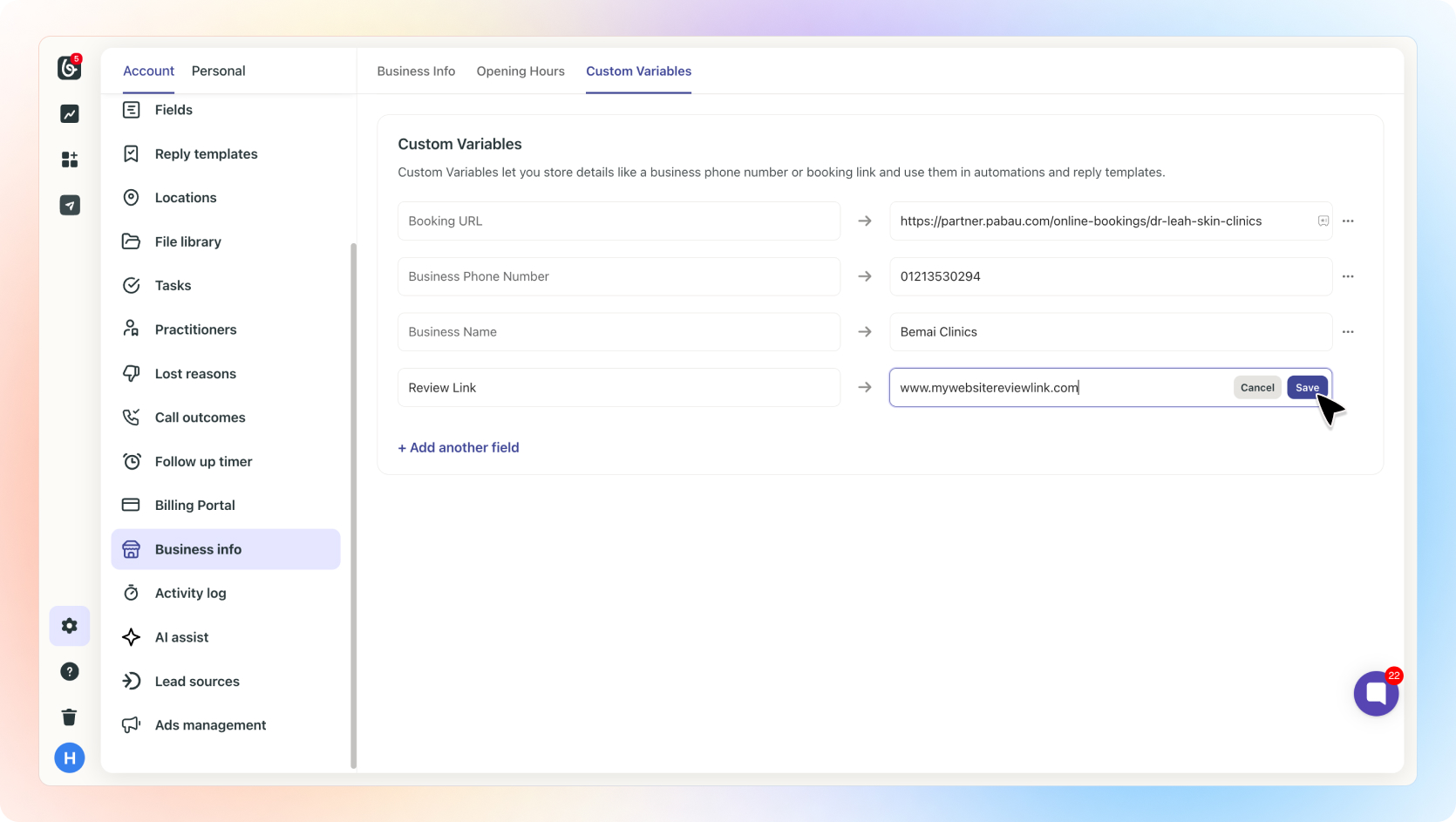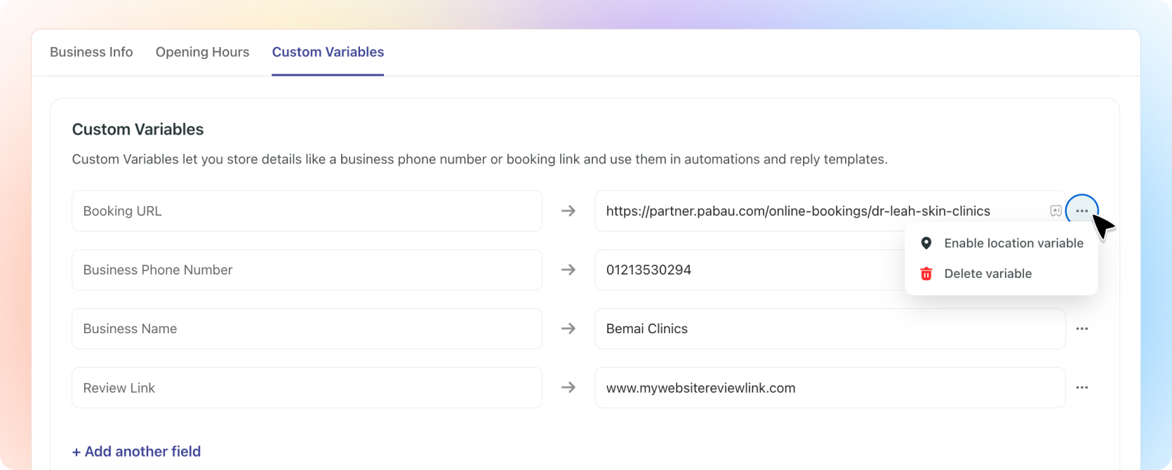 Custom variables ensure that adding things like booking links or business phone numbers into your messages is super simple! - Including if you have multiple locations.