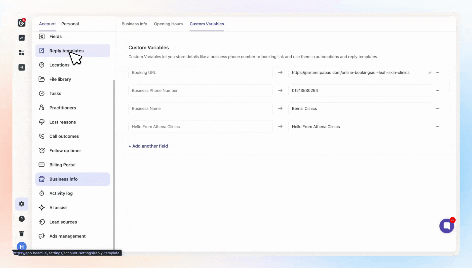 Custom variables: Store details like a business phone number or booking link and use them in automations and reply templates.
