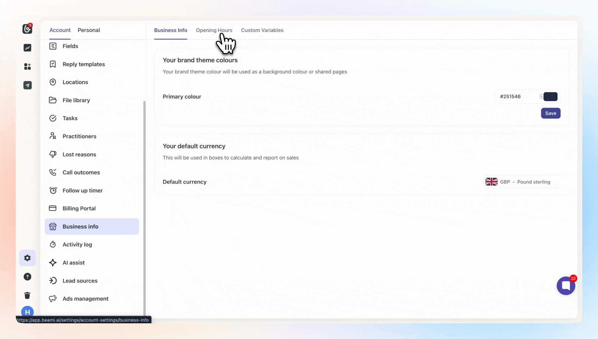 The Business Info section in your account settings lets you configure key details for your Beami account.