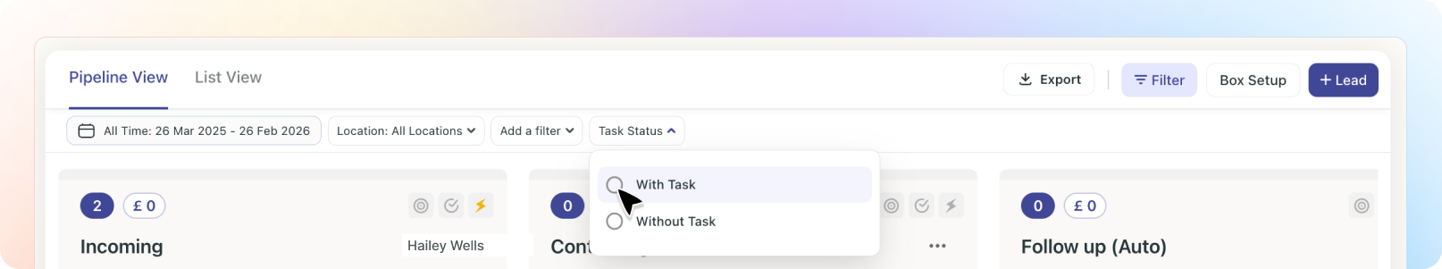 You can filter leads that have tasks added or the ones without tasks available in both Pipeline and List views.