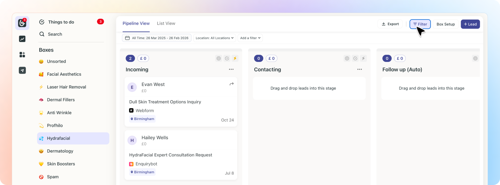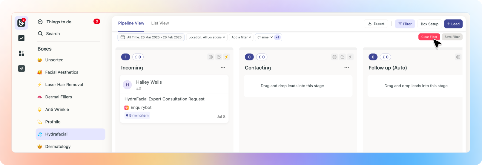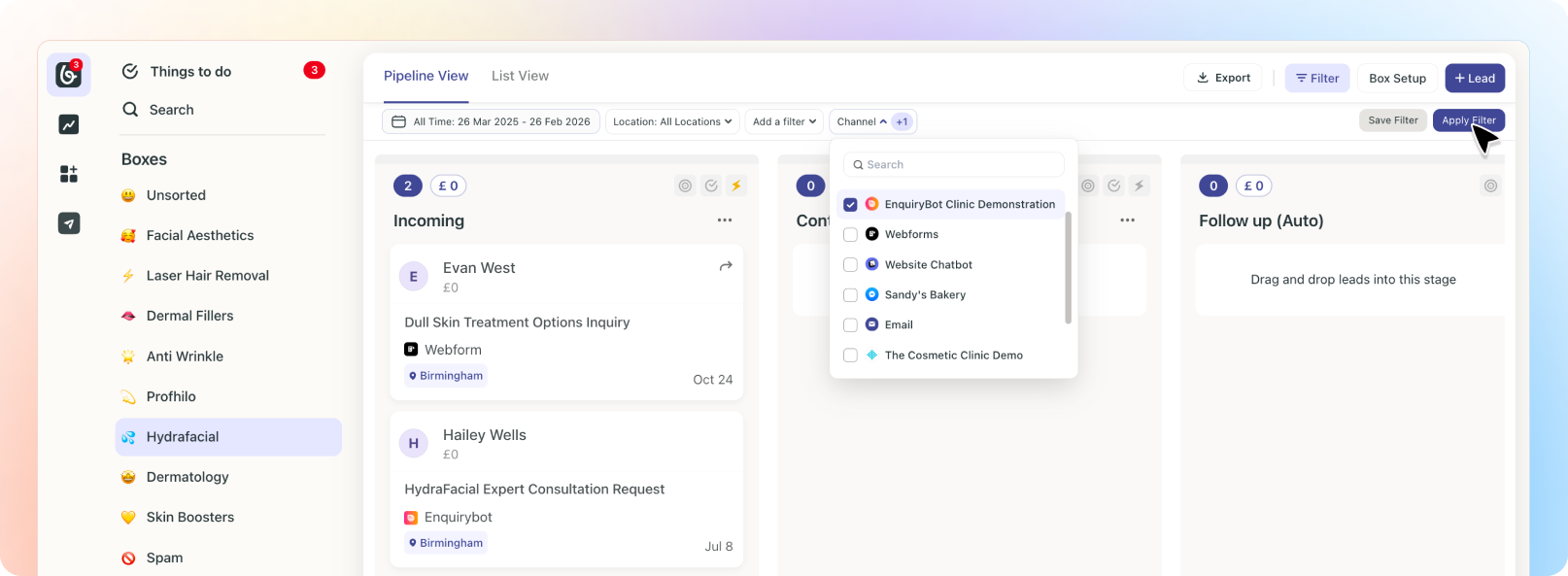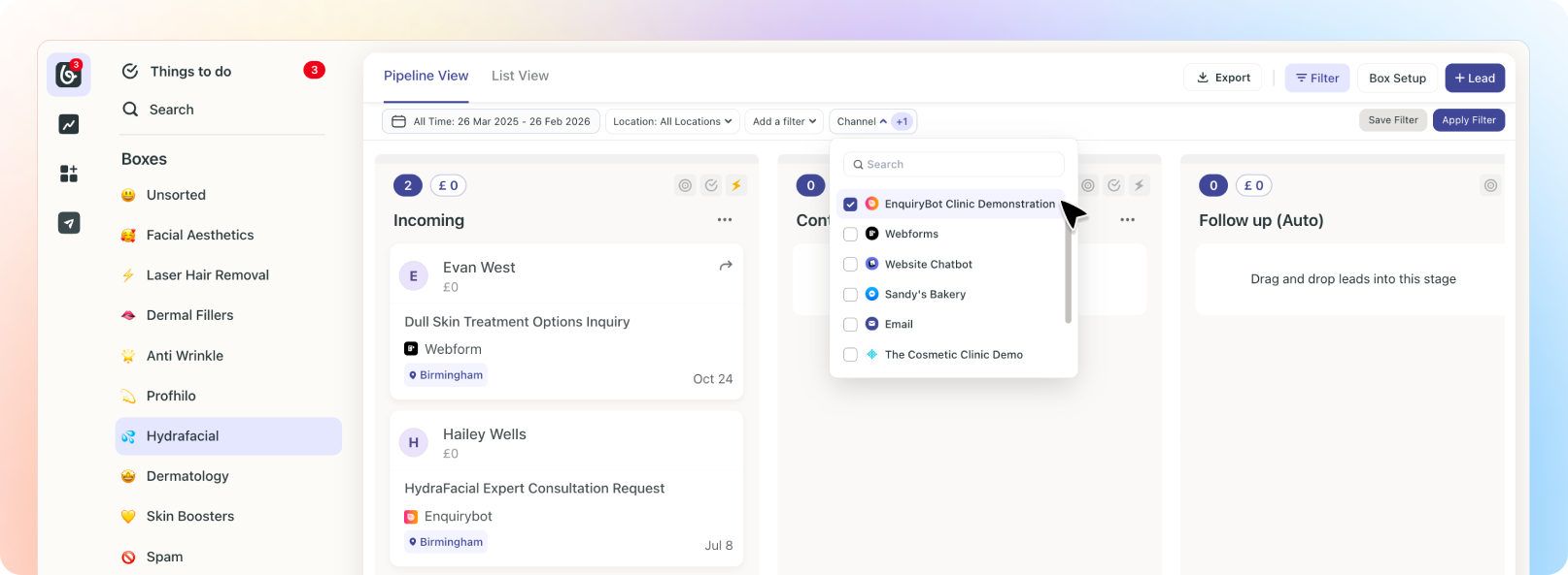 Inside a Box, you can quickly and easily filter leads by Assigned User, Channel or Label.