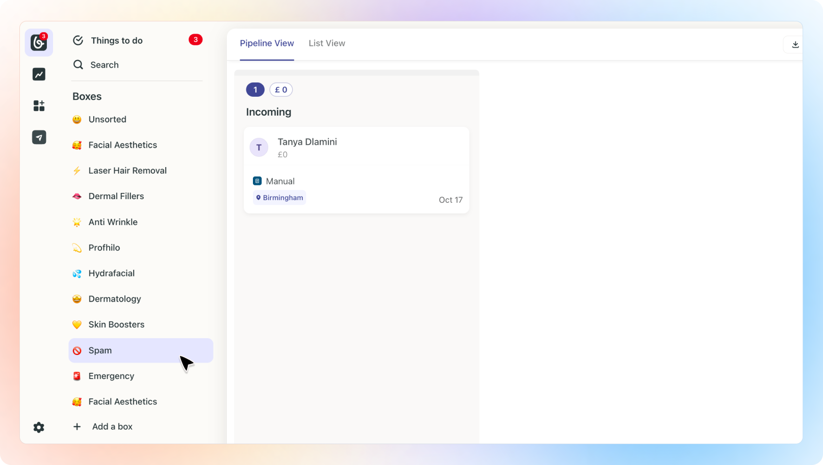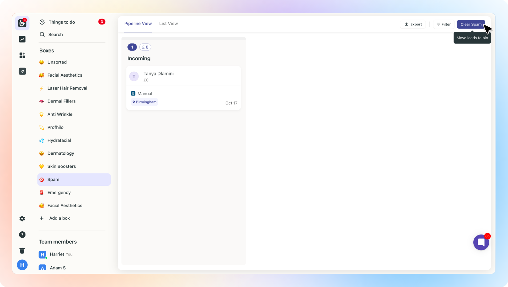 If something was mistakenly classified as spam, you can move it from the Spam Box to another Box. Once moved, it will be recognised as a legitimate lead and will appear in the chosen Box, Things to do, and Reports.