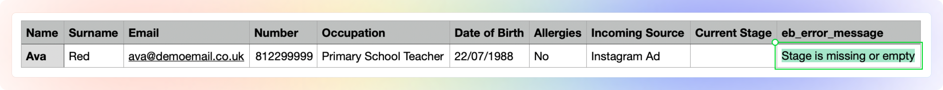 Once you download and open the file, you will see the “eb_error_message” in the last column of your downloaded file. We will tell you what went wrong, in the example below, two of the stages were left empty, amend the issue (fill in their stages for this example), export the document as a CSV file and upload the newly fixed file.