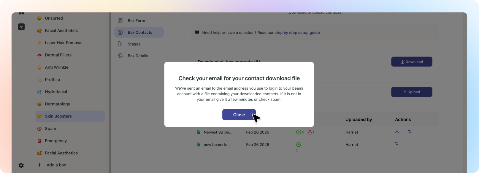 You may want to download the contacts in a particular box at some stage. Doing that just takes one click. Simply click on the download contacts button.