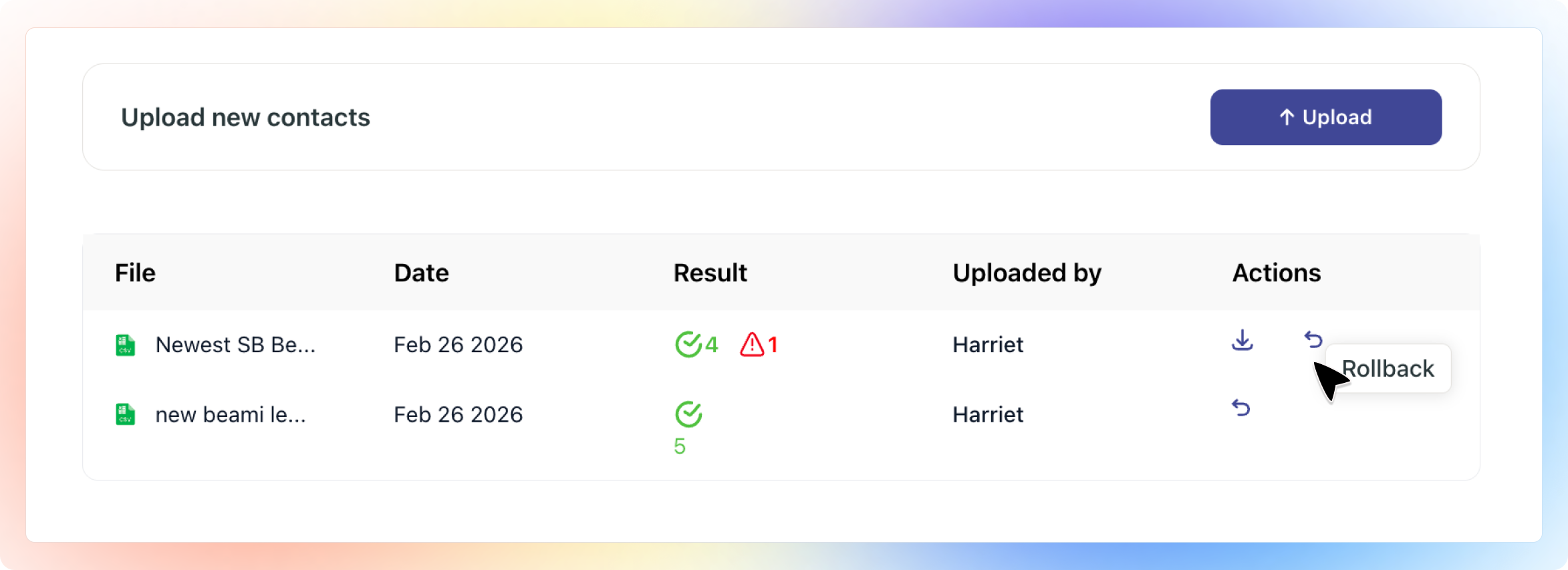 Keep in mind, if you choose to rollback the contact import, all the contacts you imported in that upload will be deleted and cannot be recovered.