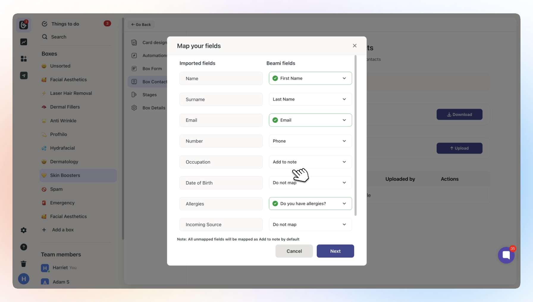 If a field doesn’t match any in Beami but you still want to keep the information, choose the “Add to note” option.