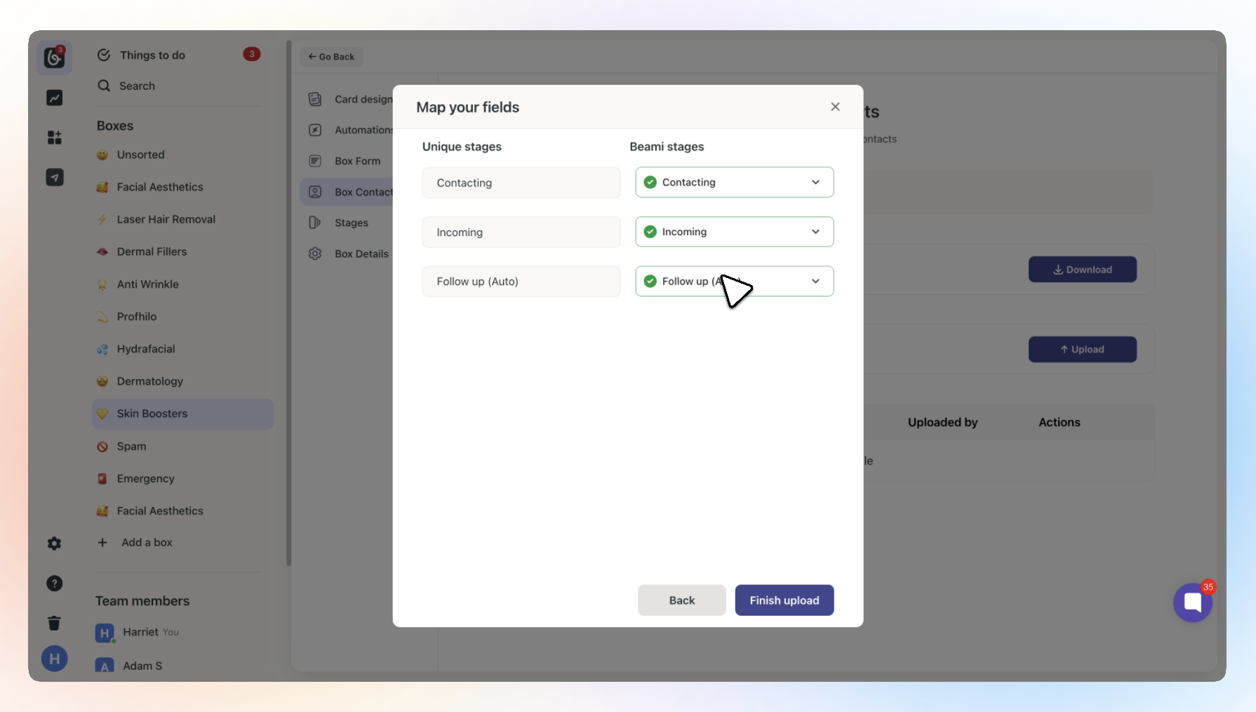 On the final mapping line, you will have the option to select the Box stages that you would like to import these contacts to. Simply click the dropdown, and select the stage.