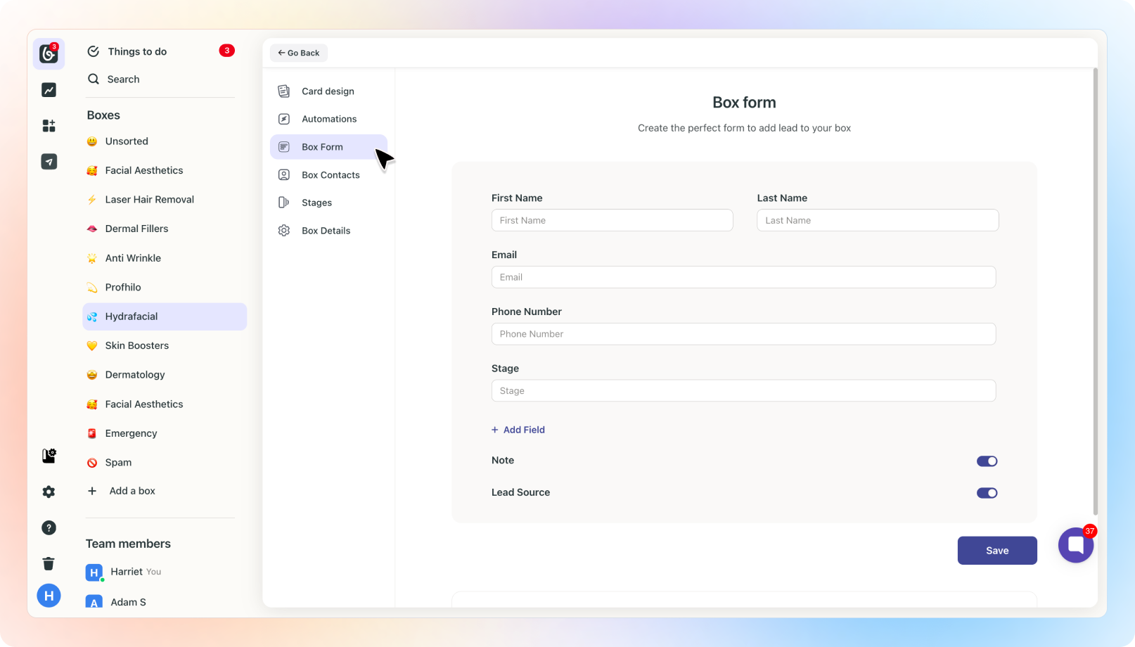 Box Forms allow you to create custom forms for specific Boxes. Use them to easily collect relevant information and route leads right into your workflow.